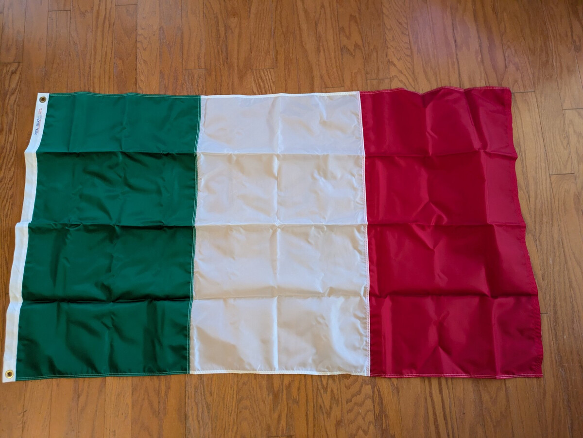 The Italy National Nylon Flag is a 3 x 5 feet flag made of Nylgo material, manufactured in the United States. The flag comes in a new condition and is packaged in a box.