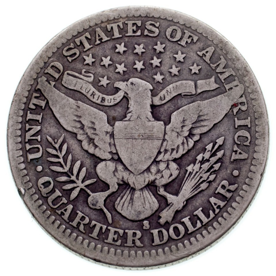 1908-S 25C Barber Quarter in Very Good VG Condition, Natural Color