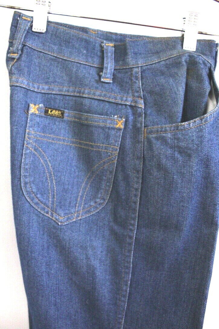 RARE deadstock (NOS) vintage 1980s Lee women?s jeans in classic blue cotton denim. Features a flattering high waist, straight legs, orange topstitching, zipper fly, and copper rivets. Crisp and structured, with that authentic ?mom jean? cut now iconic in retro styling.
