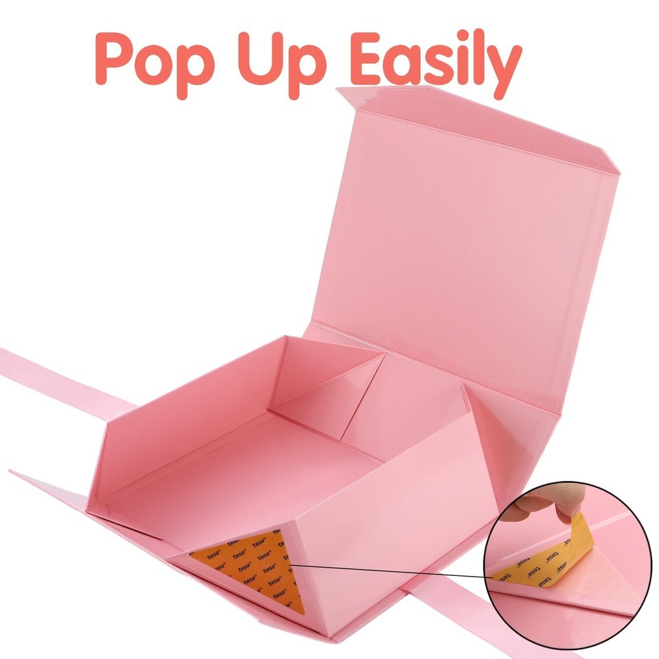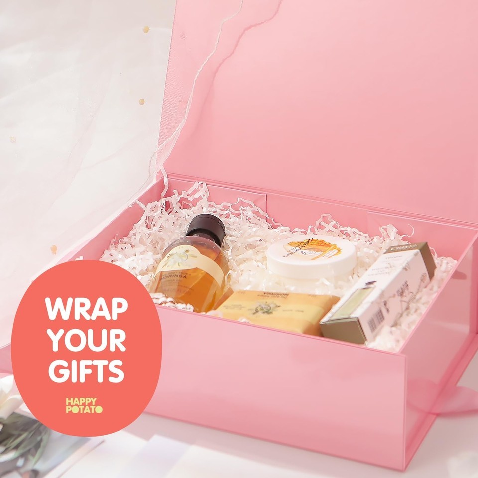 Pink Gift Boxes Size : Our gift boxes with ribbon outside measure: 12x8.5x4.1 inch, inside dimensions: 11.5 inchx8.1 inchx3.8 inch. All dimensions are measured manually with deviation (range)at 1-3 mm, subject to the product. This luxury gift boxes are shipped flat, easy to assemble,Magnetic Lid: HAPPY POTATO large pink gift boxes have a concealed and robust magnetic closure which allows the boxes to be opened and closed repeatedly without any problems. It can hold presents like scarves, hankies, clothing, toy, small candle, perfume or cologne and more,Ribbon and Card: The sturdy gift boxes are made from Hard Board. Our paper from well-managed forests, the tape use by Tesa from Germany. Our gift boxes with ribbon also provide some white greeting card for your gift, that will make your gift look more elegant and creative,Fit for All Occasions: Elegant and easy way to wrap, contain, protect and present a special gift for birthday, baby showers, Easter, Mother's Day, Christmas, Weddings, Anniversaries, Graduations and so on. Large gift box for presents is durable and reusable, just wipe it off gently, and it will be very clean,HAPPY POTATO provide magnetic gift boxes in various colors and sizes in different packaging quantities for your choice, free feel to visit our amazon store by click "HAPPY POTATO" next to the title. Wish you happy every day