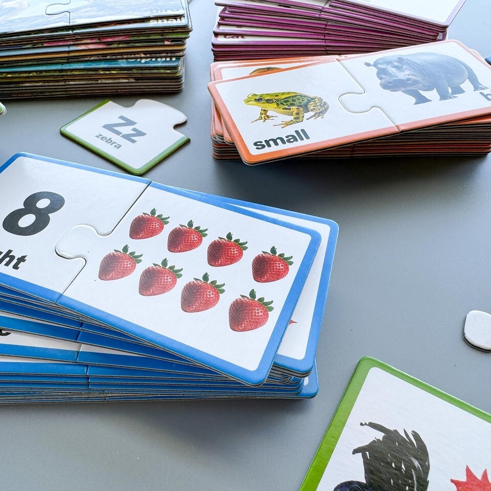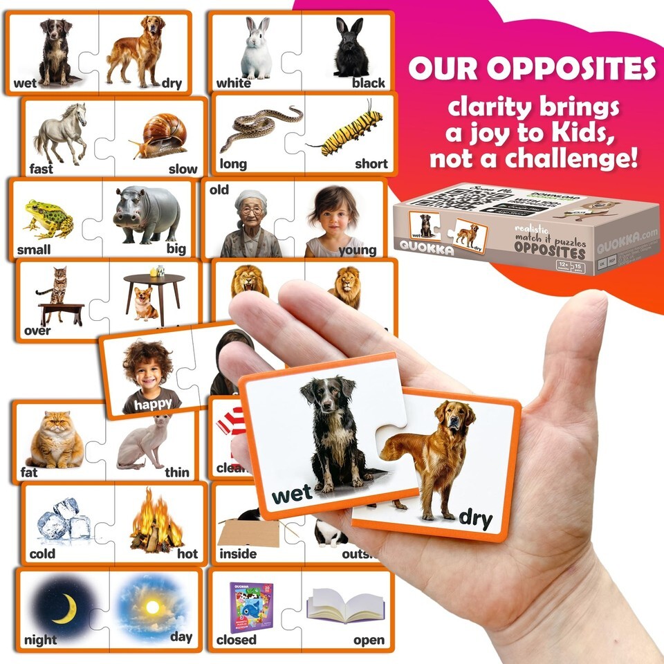 MATCH IT PUZZLES FOR TODDLERS: two-piece realistic puzzles with Numbers Animals serve as learning toys for 1 2 3 year old girls and boys; 5 boxes with self-correcting puzzles for baby teach animals names and entertain kids with heads tails match game.,EDUCATIONAL PRESCHOOL PUZZLE TOY: first puzzles to help toddlers ages 1-3 to learn and remember basic animals while developing eye to hand coordination, fine motor skills, logical and analytical thinking of your children; One puzzle pair size is 2.5 ? 5 inches,DURABLE CARDBOARD PUZZLES SET: thick modern cardboard cards technique makes our jigsaw puzzles last for years; American and European certification for safety and quality; Every puzzle piece is well rounded and examined before packing into the box,PERFECT CHRISTMAS GIFT: improve motor skills together; this is a fun way to introduce and explore numbers, animals and opposites with your baby at home; Learning games that you can store in a box; Interesting even for baby puzzles 12-18 months,BOOST CONFIDENCE IN KIDS: combination of realistic images and big jigsaw shapes makes these puzzles an ideal way to foster confidence in your kid before school years; Self-correcting puzzle pieces improve logical and analytical thinking at an early age