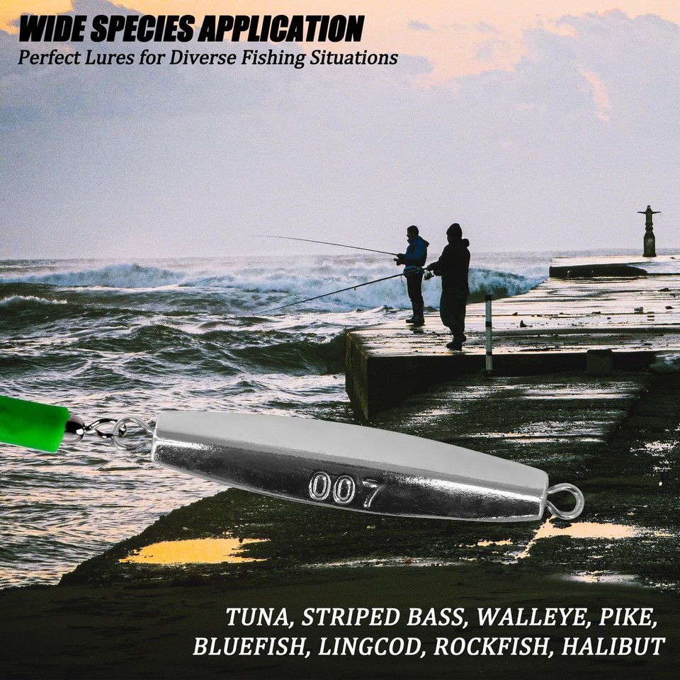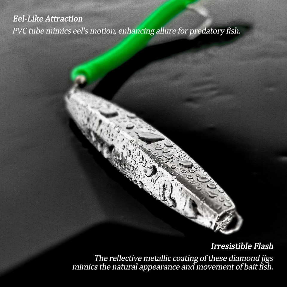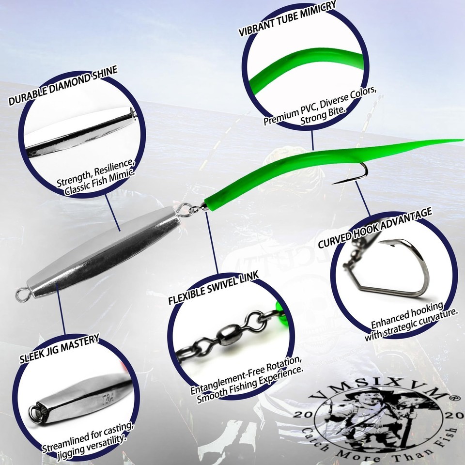 MaterialïOEStainless Steel | Skill Level: All-level, Beginner, Intermediate, Professional VMSIXVM Saltwater Fishing Jig, A True "go-to" Fishing Lure for Any Species!!! VMSIXVM diamond jigs lure crafted from high quality materials provide brilliant flash in water. PVC tube split like eel motion wobbles within the water More reflective surfaces attract fish and make them strike, mimics the movement of a desperate fish trying to get away from being eaten, which incites the predator instinct to chase it down and eat it, enhancing your fishing success. Premium Sharp Hook with Split Tube VMSIXVM flat metal Jigs equipped with a super sharp hook, designed with high carbon steel which delivers unrivaled sharpness, hook penetration, saltwater corrosion resistance ensures longevity and performance even in the harshest marine environment. Try Them Right Now See Results for Yourself In short, if you want to take your fishing game to a new level, you need to try VMSIXVM jigging saltwater jig lures kit.