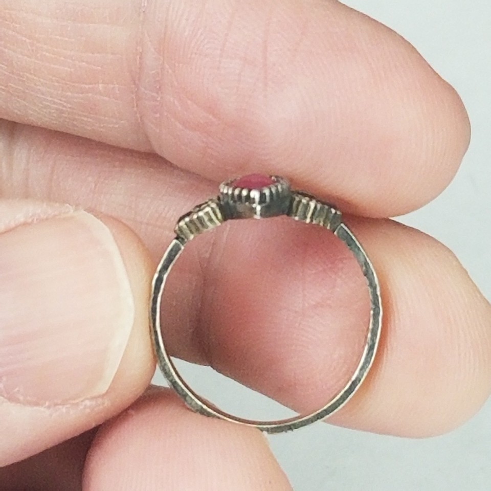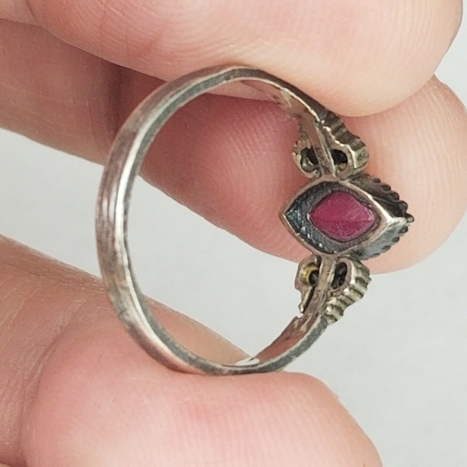 Ladies size 6. Looks to be genuine ruby but I havent had it tested. Good shape with little tarnish. Missing one little gemstone. (keep this in mind before purchase) SEE PICTURES.