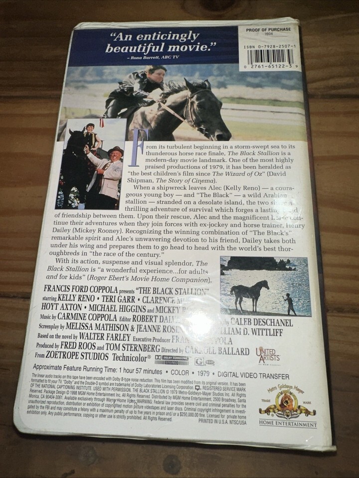 The Black Stallion VHS Tape is a classic children's and family movie directed by Francis Ford Coppola and produced by MGM Home Entertainment in 1979. The film follows the adventurous equestrian story of a young boy named Kelly Reno and his beloved black stallion. With its heartwarming tale and family-friendly appeal, this VHS tape is a timeless treasure for fans of The Black Stallion (1979 film) and those who enjoy stories about friendship, courage, and the bond between humans and animals.