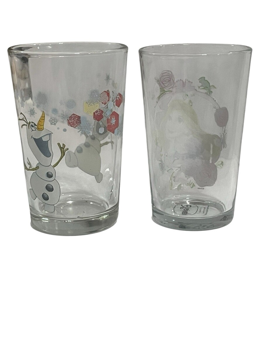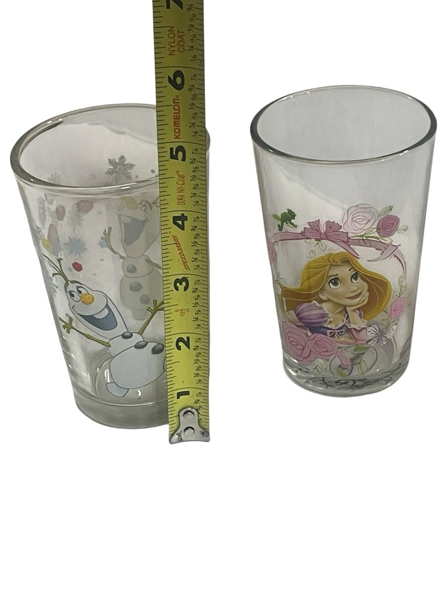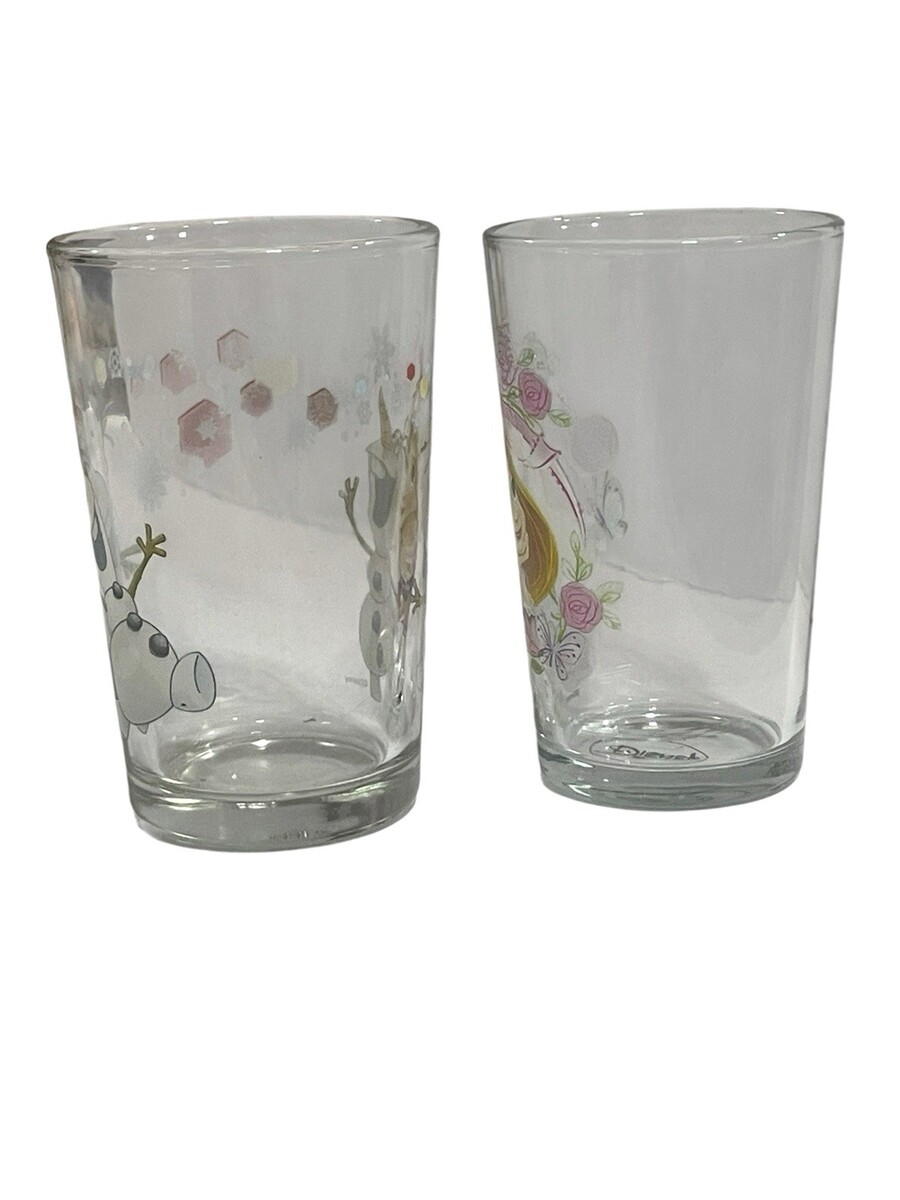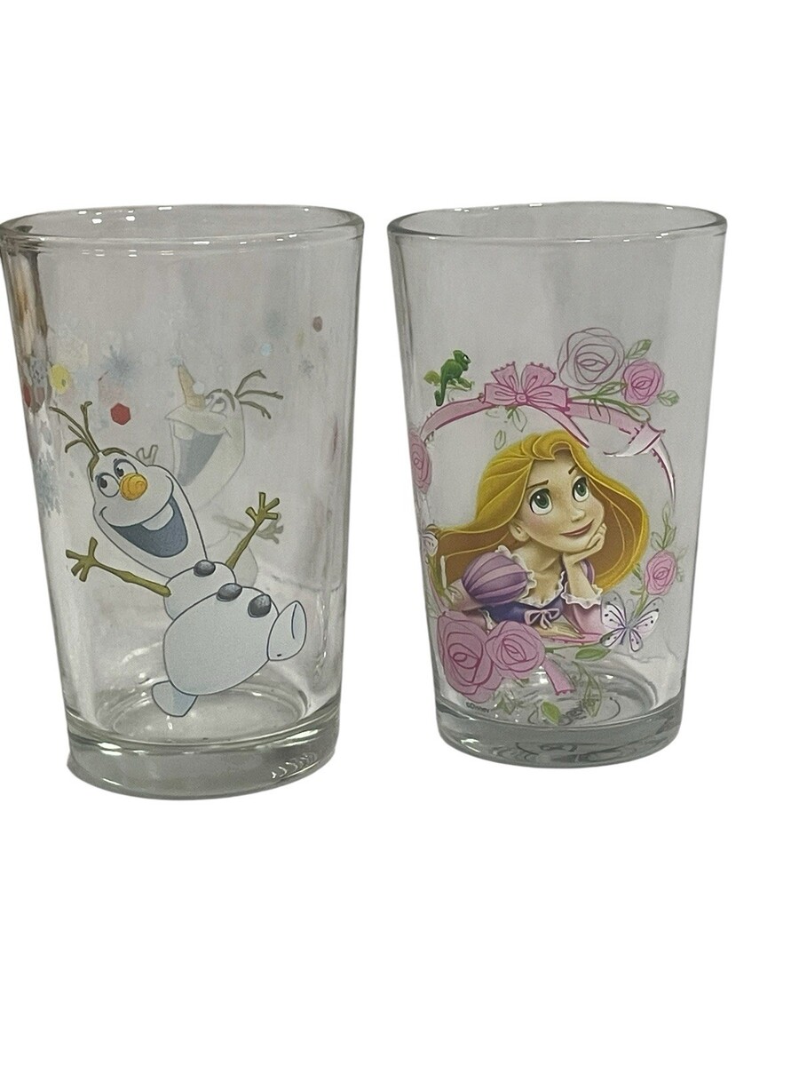 This product is a set of two Disney Frozen Olaf and Rapunzel Princess Amora children's beverage glasses. The glasses feature characters from the Disney movies Frozen and Rapunzel, making them a fun and colorful addition to any Disneyana collection. Made of glass, these cups are perfect for kids to enjoy their favorite drinks while showing off their love for the beloved Disney franchises. Perfect for adding a touch of magic to any mealtime or special occasion.