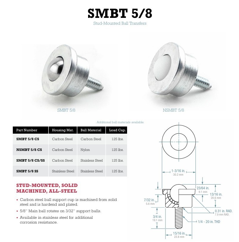 Hudson Bearings? Stud-Mounted Bearing collection combines high load capacity with low-noise output to meet your material handling and transporting needs. From discrete transfers that can carry 75 lbs. each, to our heavy duty options that can withstand upwards of 750 lbs., we have the right transfer solution for your project, regardless of size.