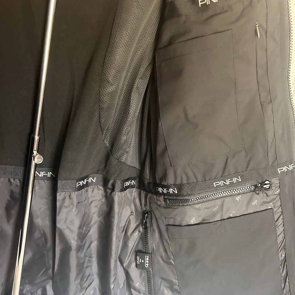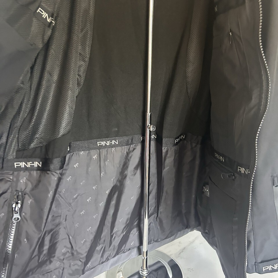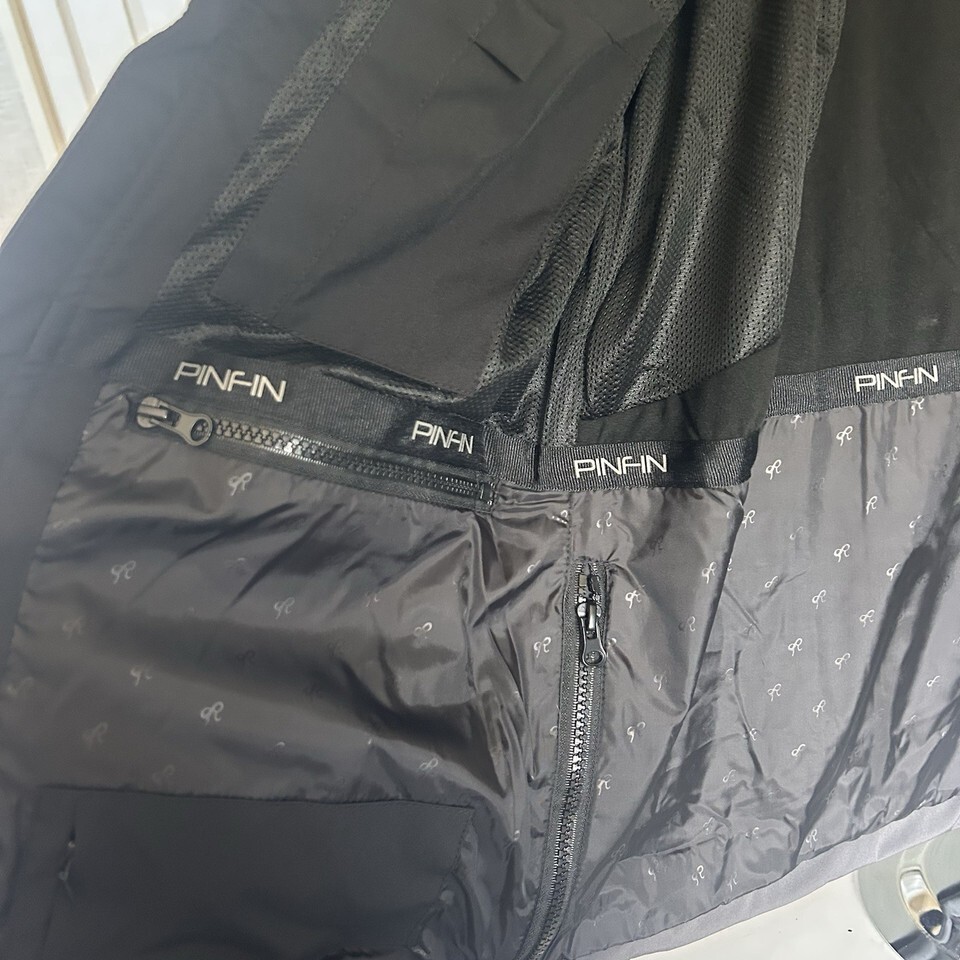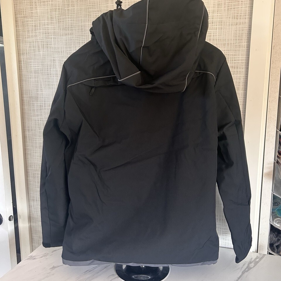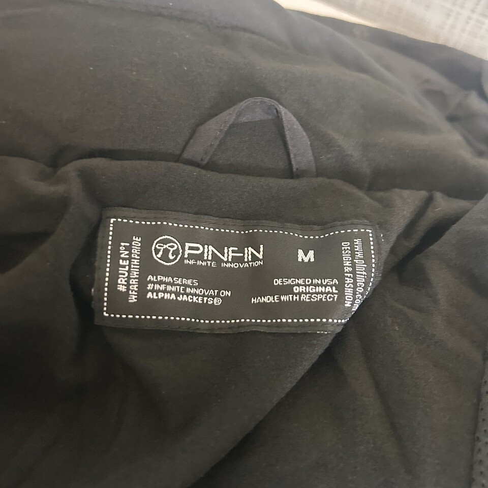 Pinfin Men's Alpha Jacket, Medium, 38" chest, 26" length, 39" shoulders. Full zip, detachable hood, inside and outside pockets. Black with gray trim. Extremely nice, $200 retail. Would make an awesome gift for the sportsman in your life. Please look at measurements.