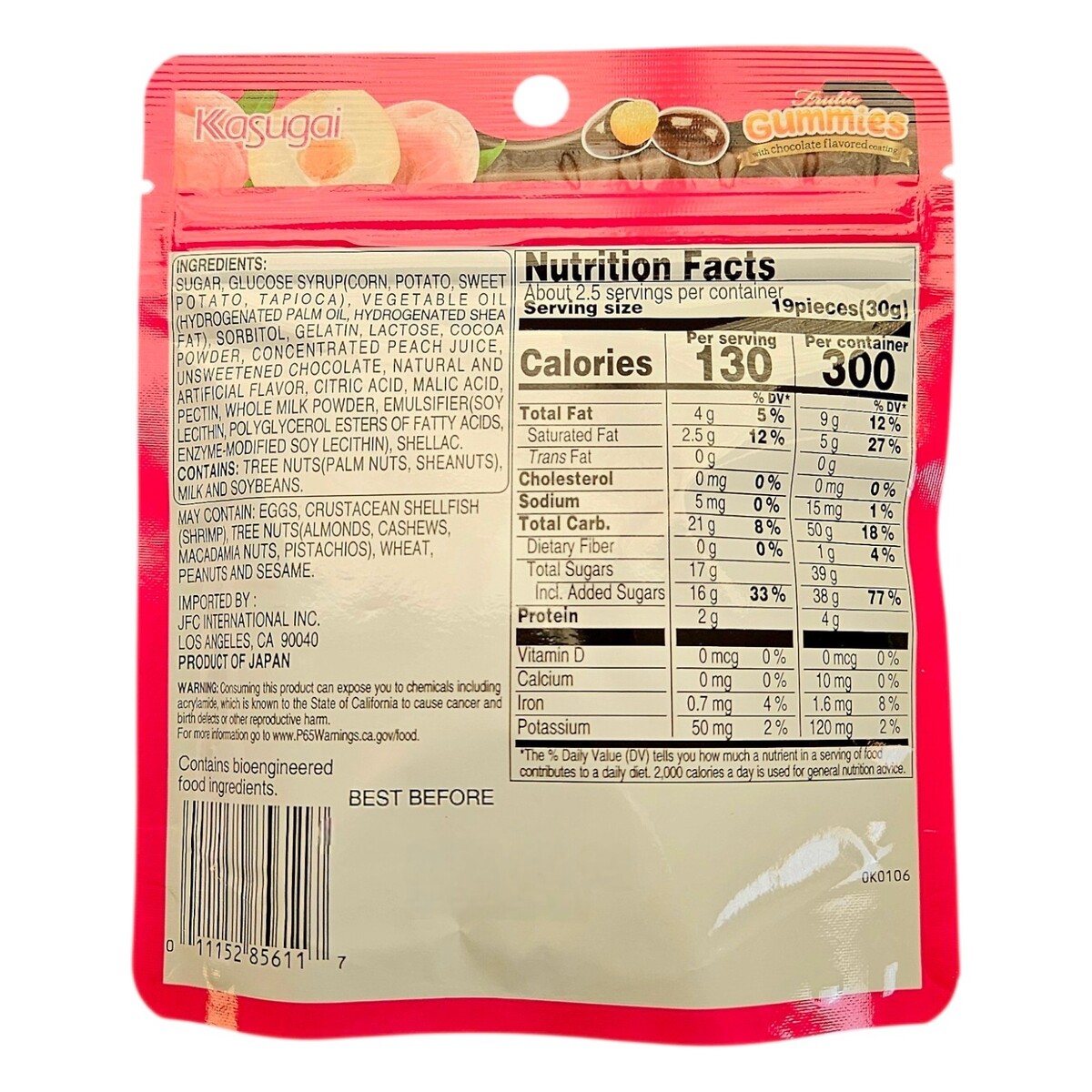 Ingredients: Sugar, Glucose Syrup (Corn, Potato, Sweet Potato, Tapioca), Vegetable Oil (Hydrogenated Palm Oil, Hydrogenated Shea Fat), Sorbitol, Gelatin, Lactose, Cocoa Powder, Concentrated Peach Ice, Unsweetened Chocolate, Natural and Artificial Flavor, Citric Acid, Malic Acid, Pectin, Whole Milk Powder, Emulsifiers (Soy Lecithin, Polyglycerol Esters of Fatty Acids, Enzyme-Modified Soy Lecithin), Shellac.