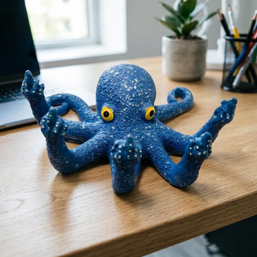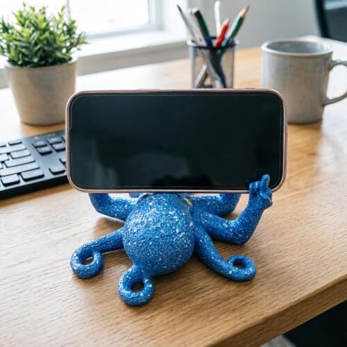 Product description: Add a whimsical touch to your desk or wall with this charming blue octopus multi-functional holder. Crafted from durable resin with a textured, speckled finish, this versatile piece measures 4.9 x 4.5 x 2.1 inches and serves dual purposes. As a desktop companion, it functions as a sturdy phone stand, perfectly angled to keep your device visible while working or streaming content. The octopus design features eight tentacles that provide stable support for your smartphone in both portrait and landscape orientations. When not needed on your desk, this clever creature transforms into a decorative wall hook, capable of holding keys, lightweight bags, or accessories. The bright blue color and playful design make it an eye-catching accent piece that brings both functionality and personality to any space. Its compact size and lightweight construction ensure it won't take up too much room whether used on your desk or mounted on the wall. The textured surface and yellow accent eyes add distinctive character to this practical accessory.