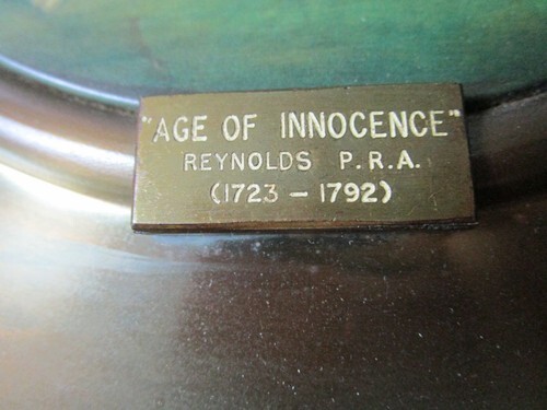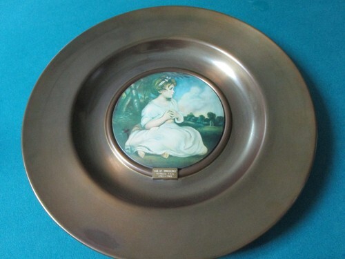 antique BRASS PLATTER PAINTED CERAMIC CENTER "AGE OF INNOCENCE" BY REYNOLDS