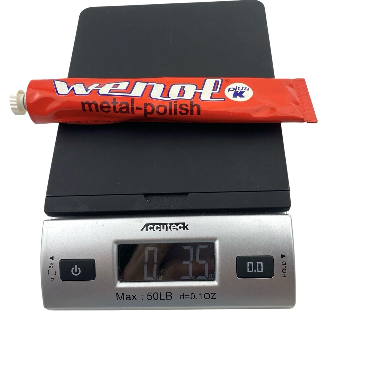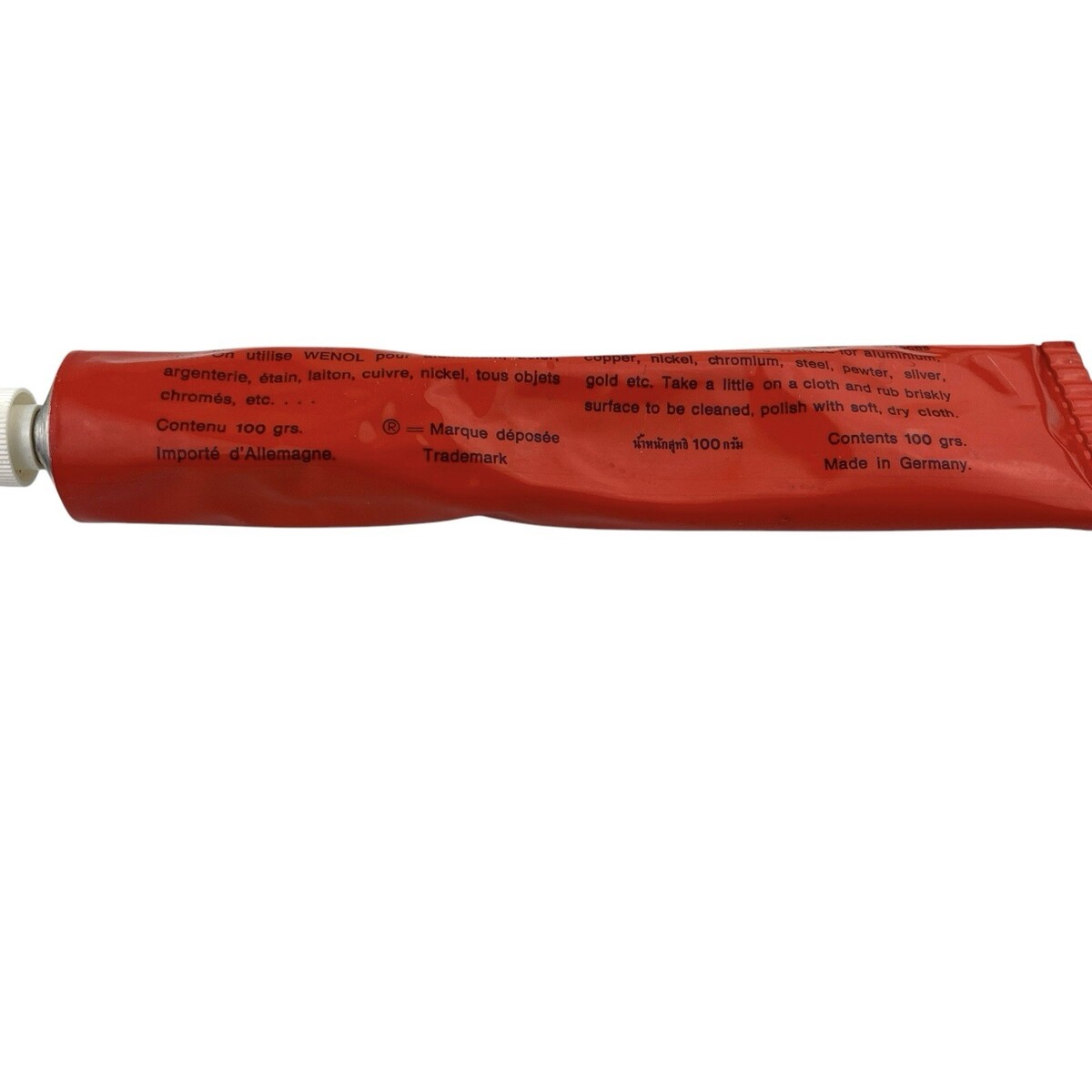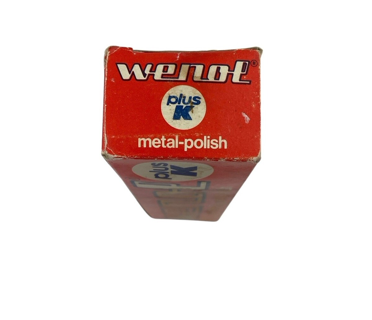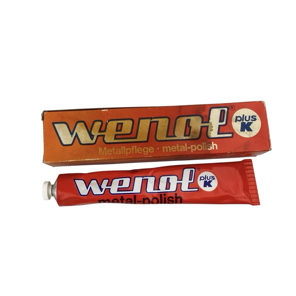 One vintage tube of Wenol Plus K Metallpfege Metal Polish. The 3.5 oz / 100 g tube weighs full but may have been lightly used; please see product weight in pictures. Made in Germany. English and German instructions on tube and original box. There is significant discoloration on the box; please see pictures. From a smoke-free home. Ships next day!