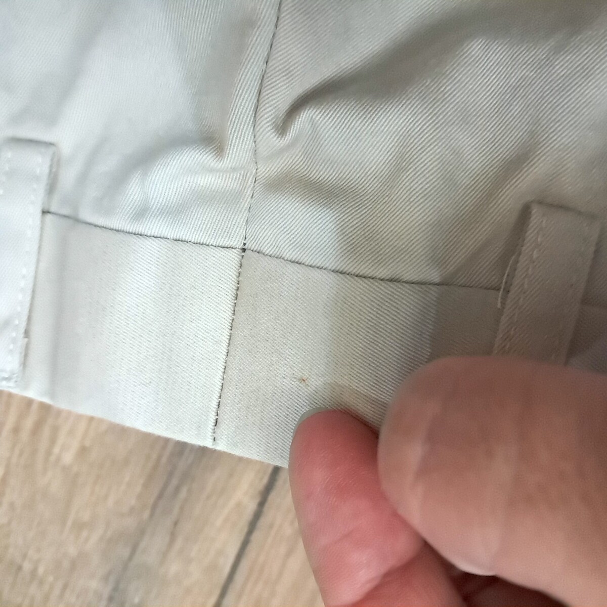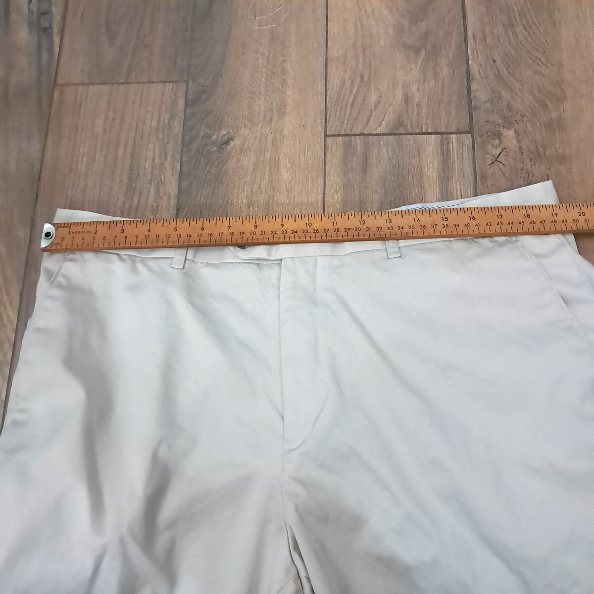 Cream/ivory/light tan color. Flat Front. Small spot on back of waist band as shown. Otherwise very good to excellent condition. See pics for measurements.