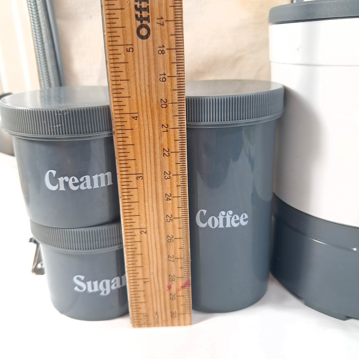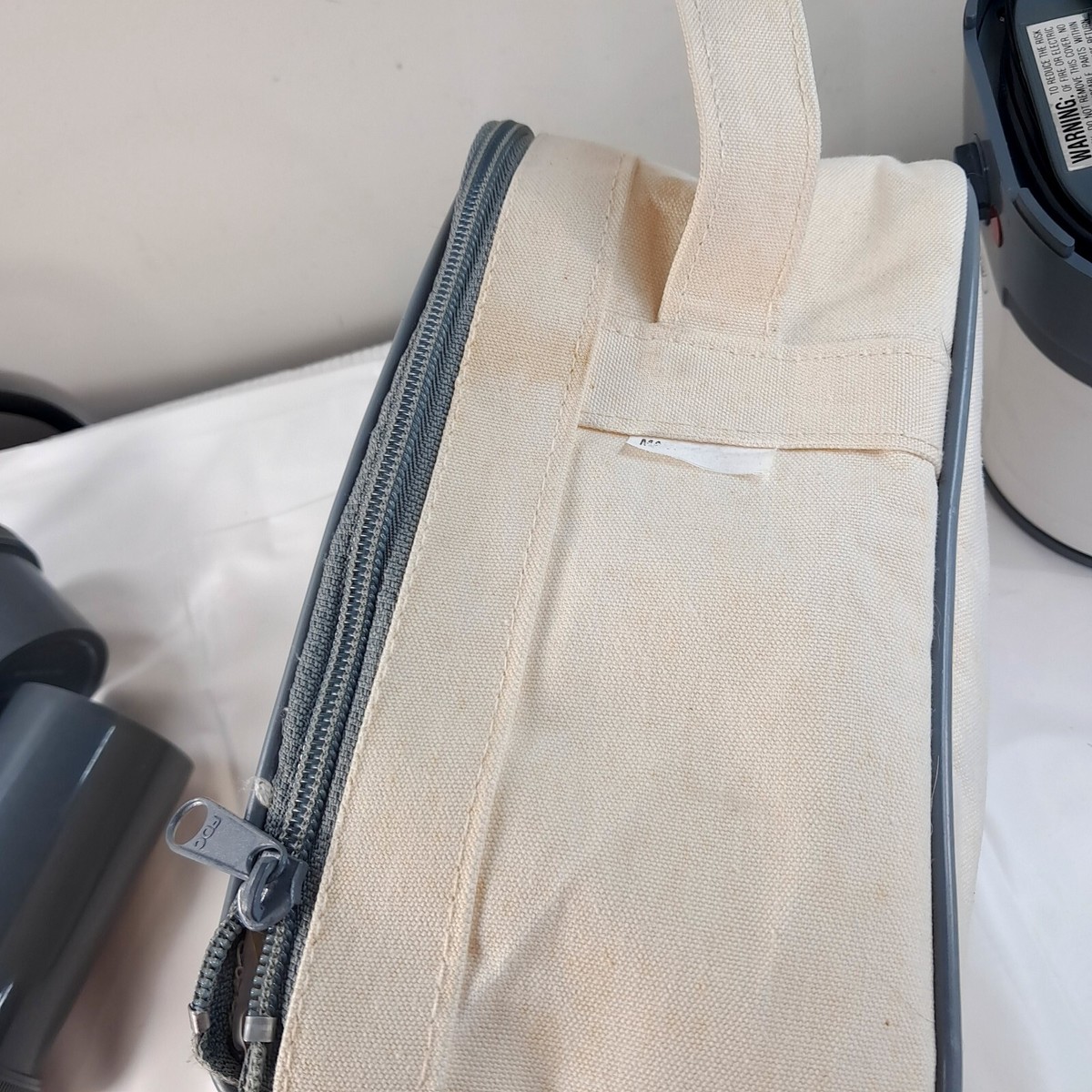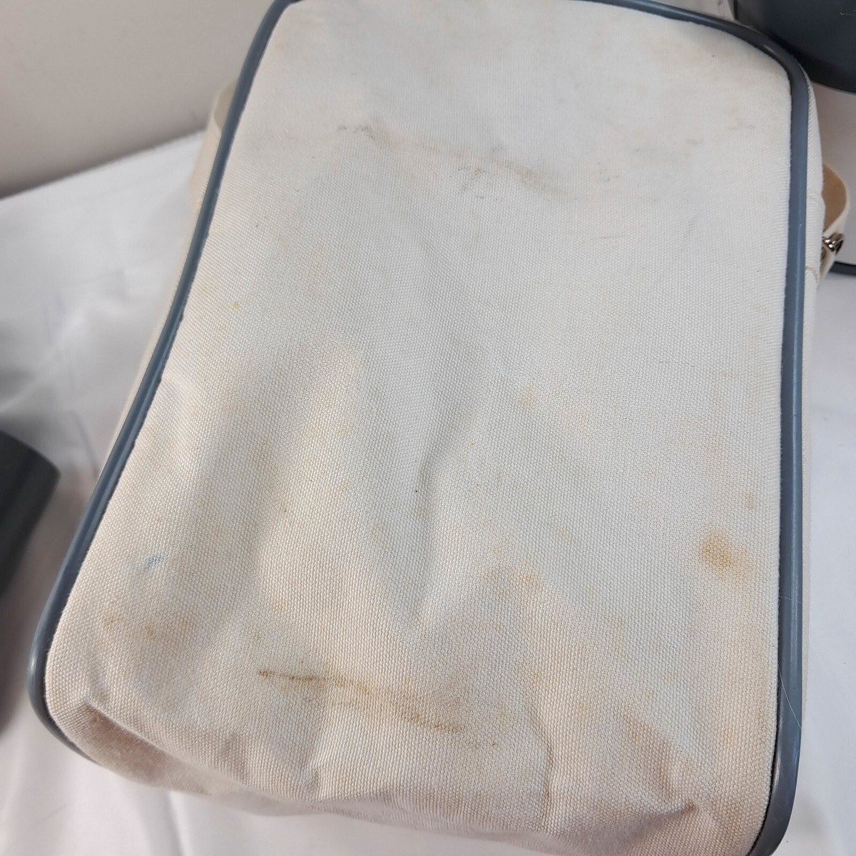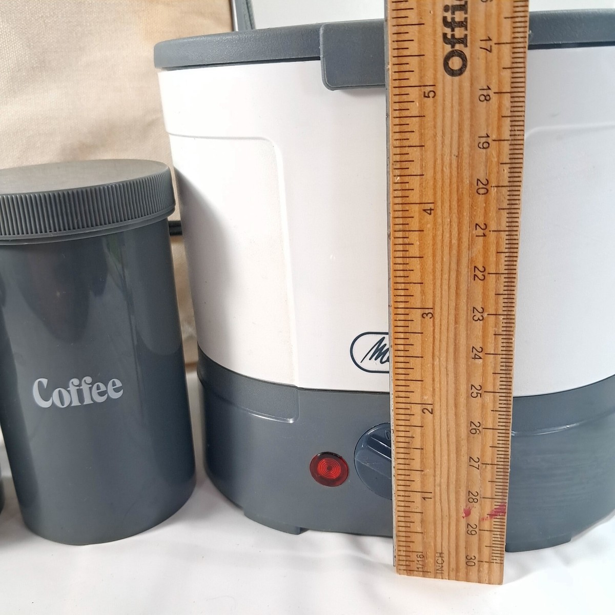 Works. Includes coffee maker cannisters for coffee, sugar, and creamer, plus bag. Bag has stains as shown, but actual coffee maker and cannisters are in very good condition.