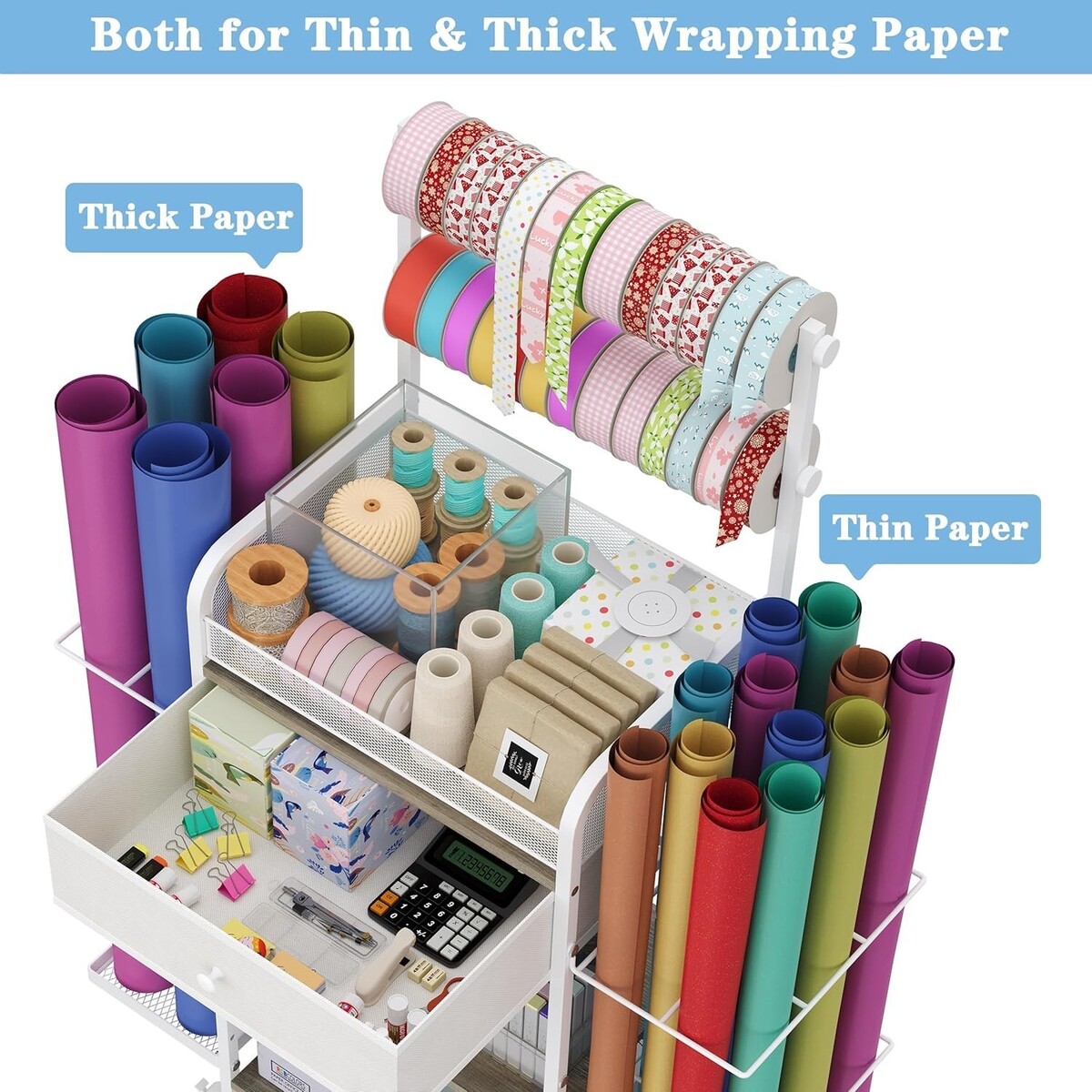 Ample Ribbon and Gift Bag Storage: 2 ribbon racks on the top serve as both ribbon organizers and gift bag storage, streamlining your wrapping essentials.