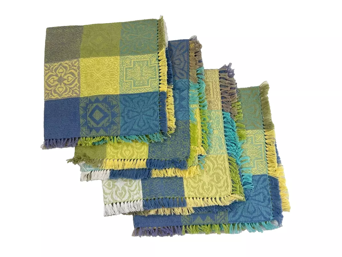 WC Designs Mosaic Blue Green Cotton 4pc Fringed Napkin Set