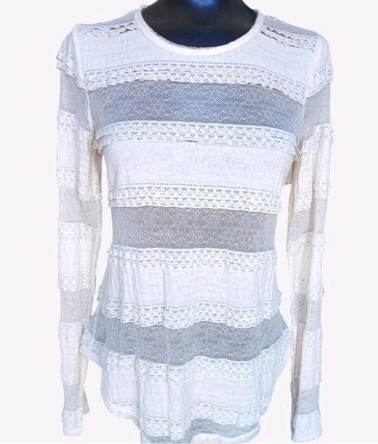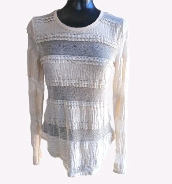 This Sheer Lacey Ivory Rachel Roy Top in size medium is a charming and whimsical piece perfect for various occasions such as travel, casual outings, workwear, or business events. The long sleeves and round neckline add a touch of elegance, while the pullover closure makes it easy to put on. Made of nylon fabric with a lace pattern, this top exudes a romantic and feminine vibe, fitting for those who appreciate hippie, princess, bohemian, fairy, or preppy styles. The sheer details add a touch of sophistication, making it a versatile and stylish addition to any wardrobe.