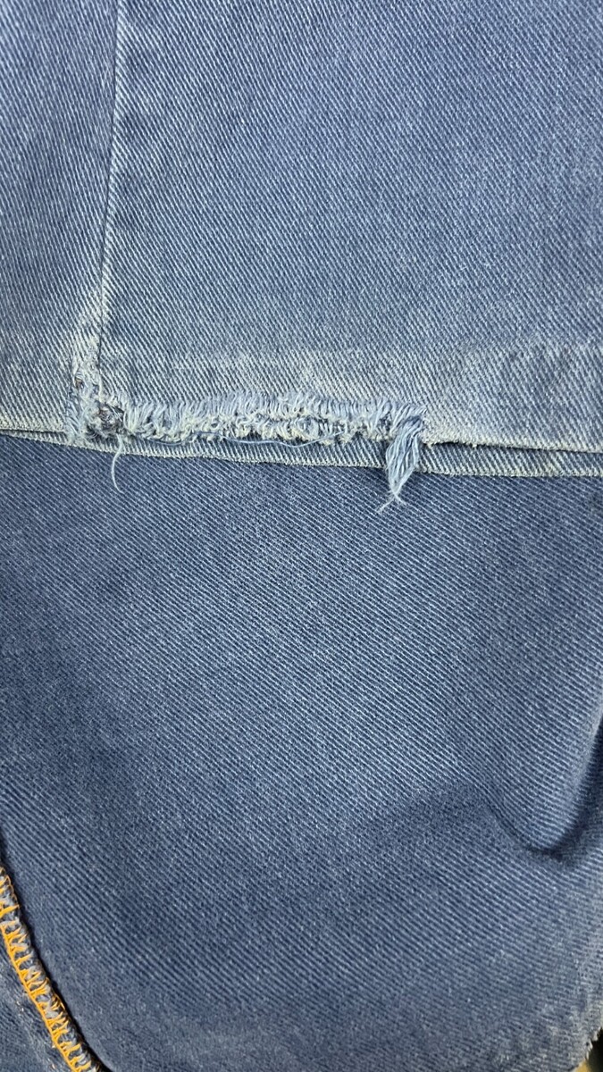 Blue cotton weave (denim-like, lighter weight), orange topstitching, high waist, wide leg bell bottoms, Sears Jr. Bazaar label, 1970s