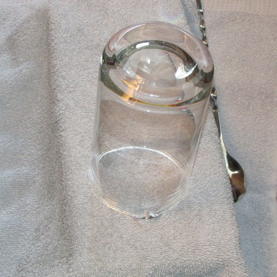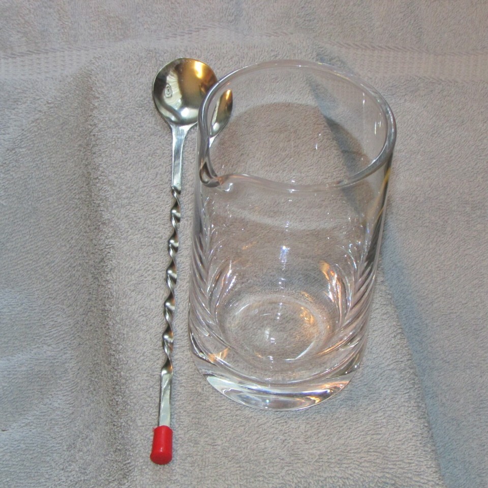 clear glass liquer pitcher 6" tall 3.5" diameter w/12" long metal spoon (Hal A)
