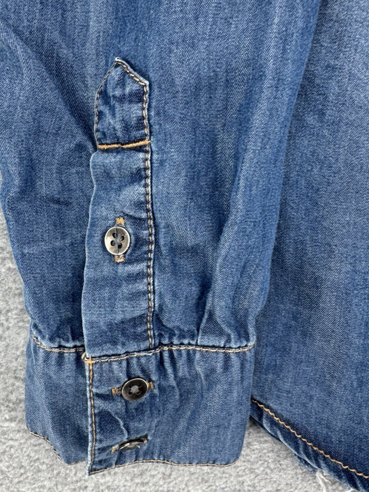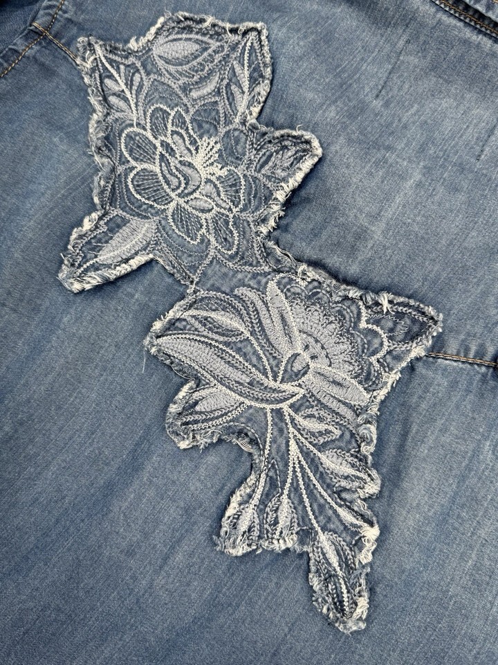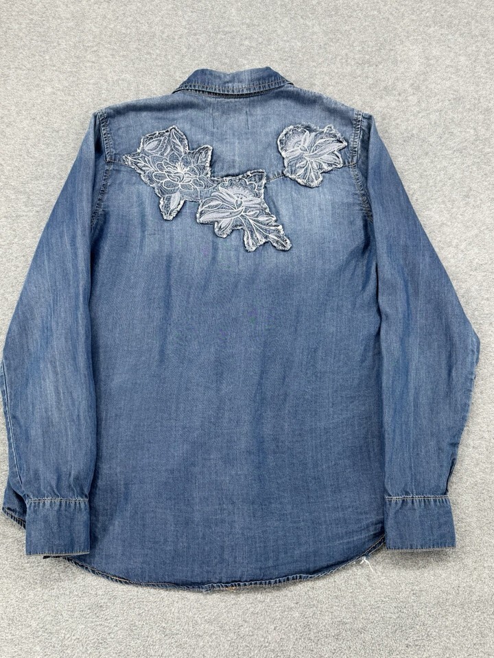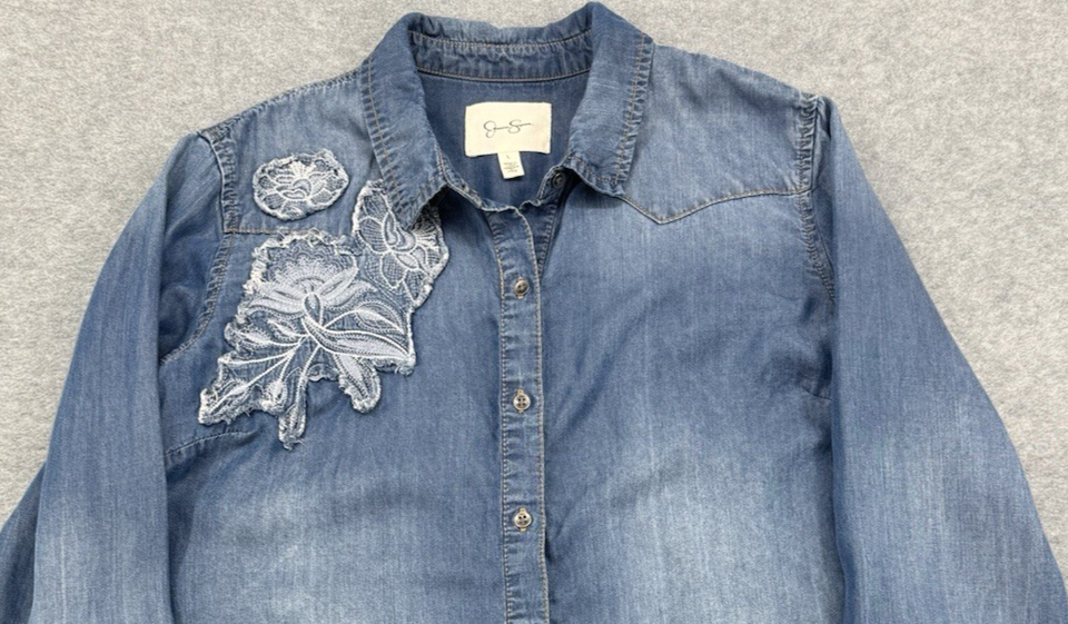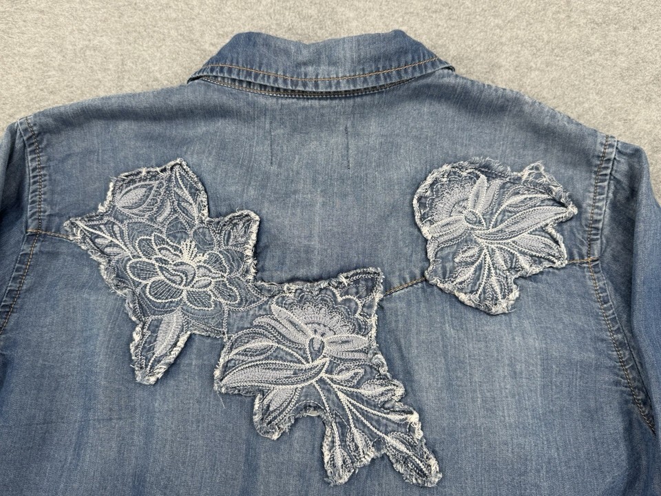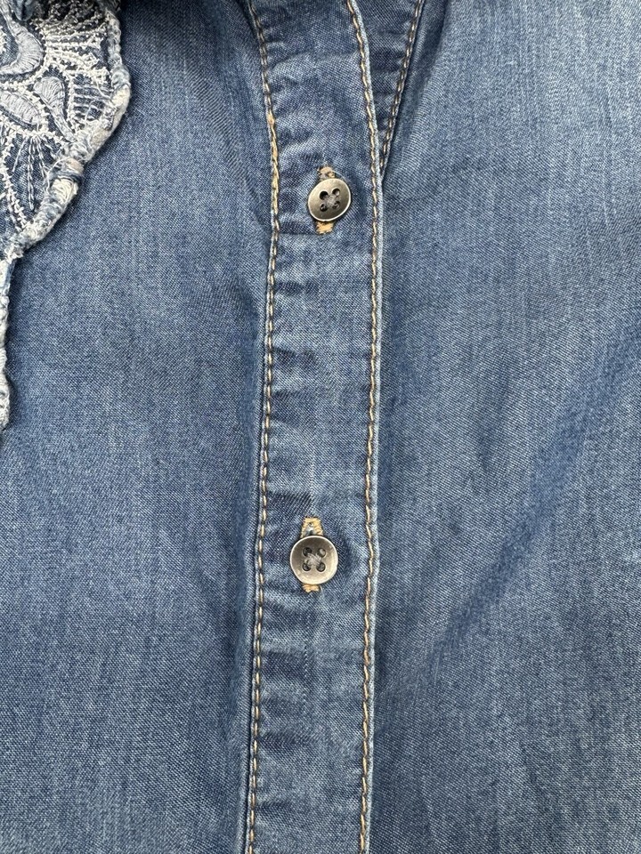 Jessica Simpson Lace Appliqué Denim Button Down Shirt Chambray Western Top L
