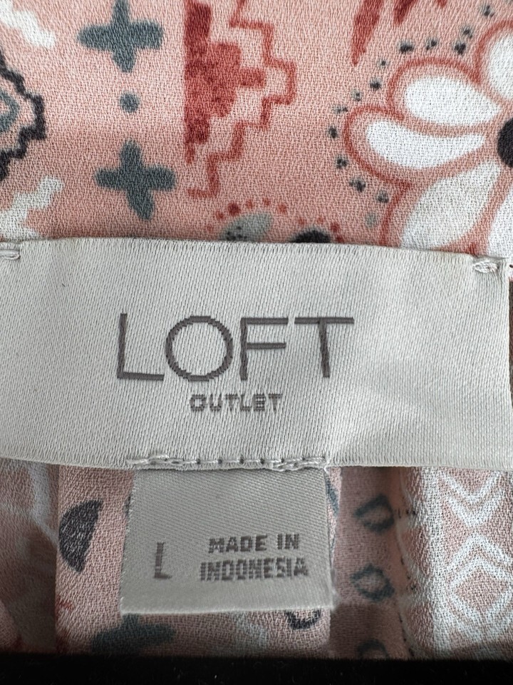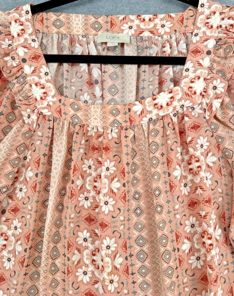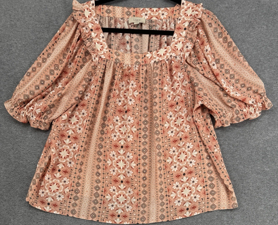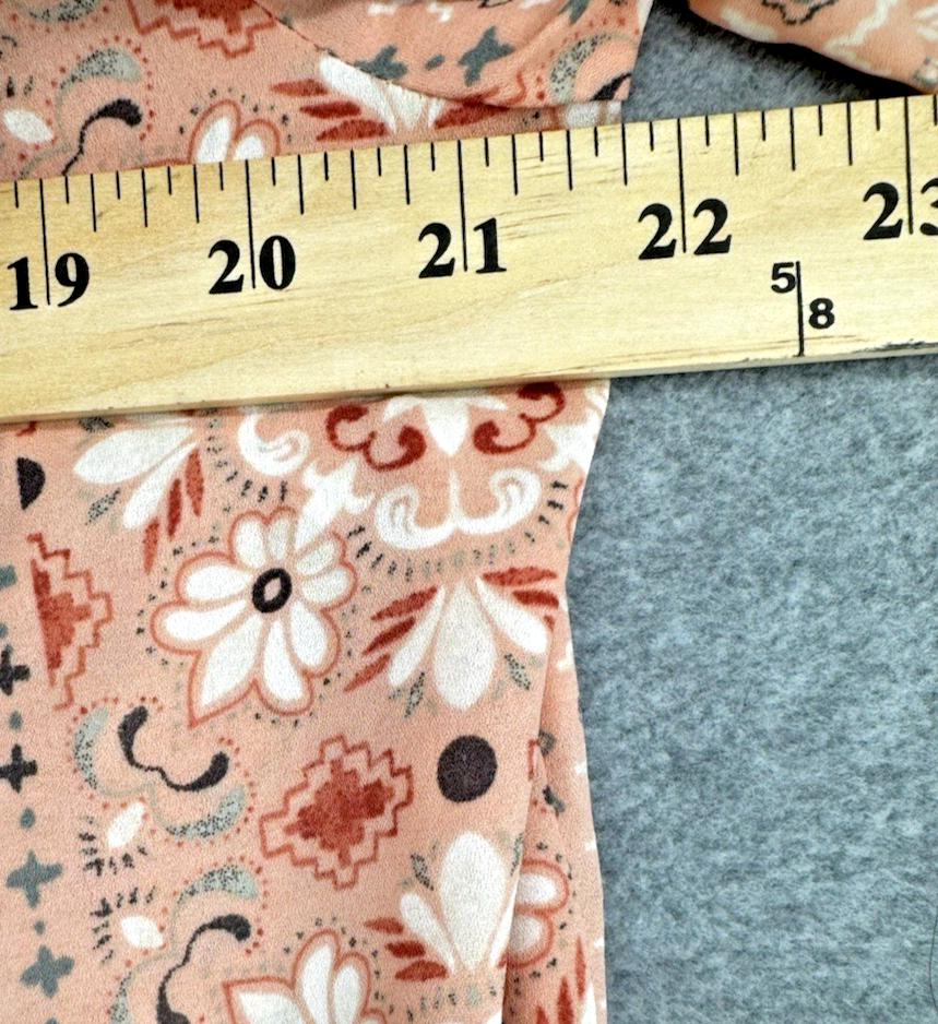 Boho Floral Peasant Blouse Coral Pink 3/4 Sleeve Ruffle Neck Top Large
