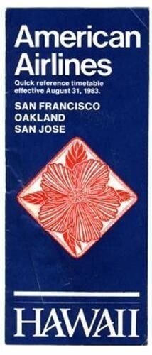 A 20 page quick reference timetable effective August 31, 1983 for American Airlines flights from San Francisco, Oakland and San Jose California Airports. In very good condition with some creases. Features Hawaii on the cover.