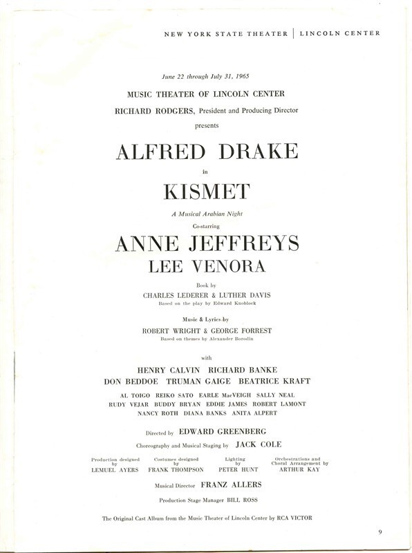 A large 24 page program from a performance at The Music Theater of Lincoln Center in June and July 1963. New York State Theatre Program for KISMET in 1963 . Starring Alfred Drake, Anne Jeffreys and Lee Venora.