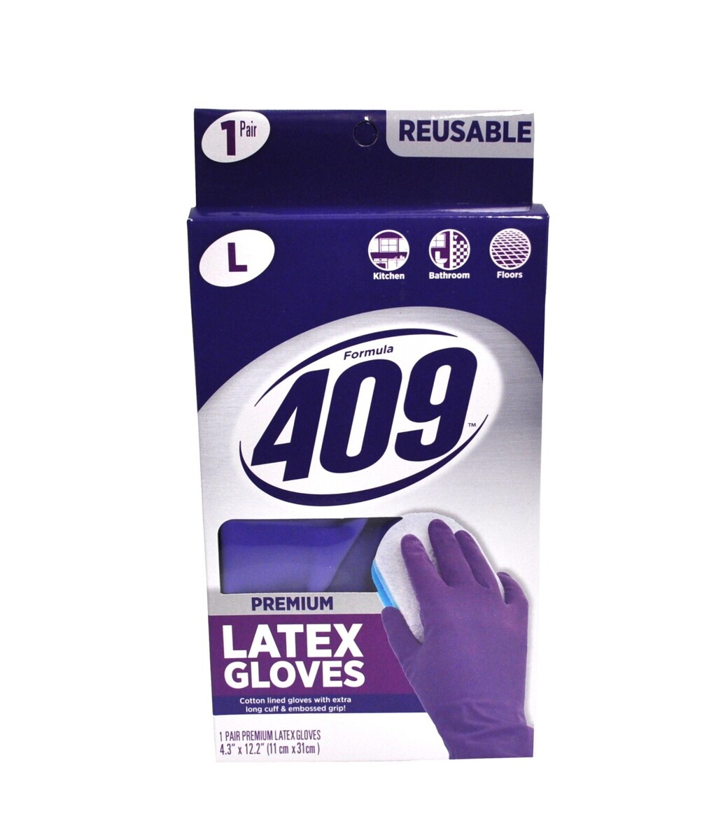 409 Premium Large Latex Gloves. Cotton lined gloves with extra long cuff and embossed grip. Formula 409 Premium Latex Gloves are great for everyday cleaning and protection needs. Use them in the kitchen, bathroom, garage, outdoors , and more. Features a textured grip and soft interior lining for long lasting comfort and performance. Reusable. Package contains: 1 Pair of Large Premium Latex Gloves. 4.3 inches x 12.2 inches. DDD-86240