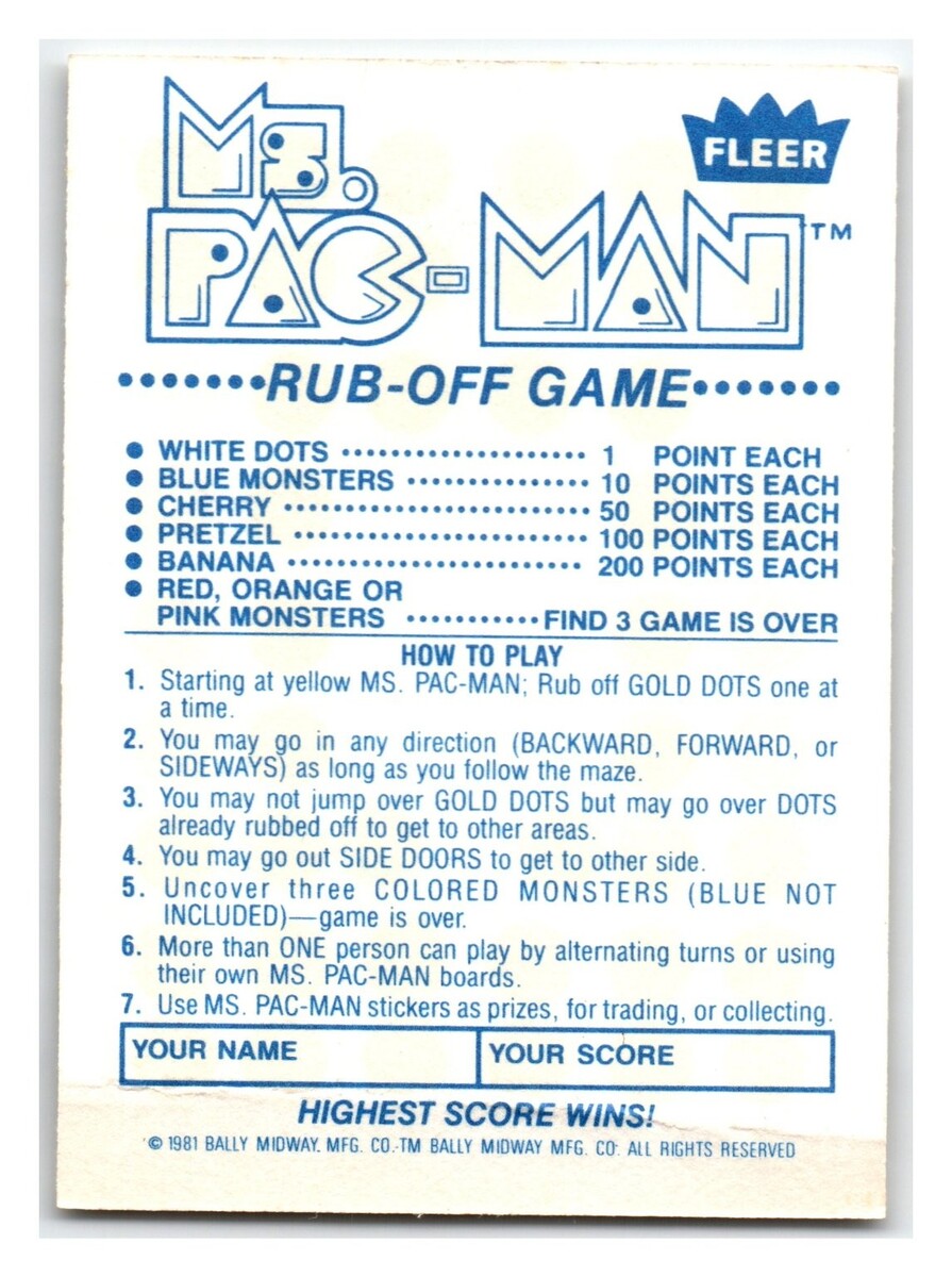 Fleer Ms. Pac-Man 1981 Rub-Off Game Bally Midway Vintage Card