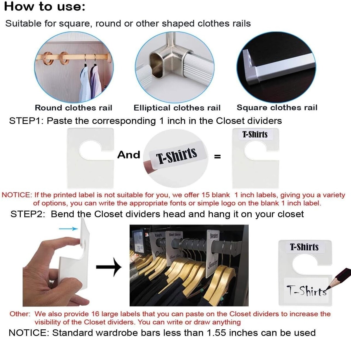 Dimensions: Large rectangular dividers at 5.35 x 3.55 inches, specifically shaped to provide visibility and accessibility on garment rails.