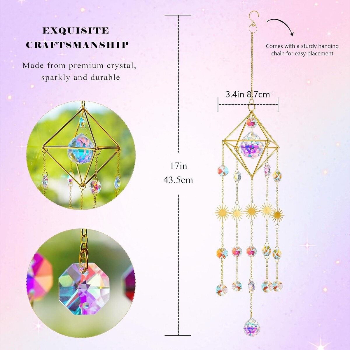 Easy Installation: The suncatcher comes with a durable hanging chain, allowing for easy installation. Simply hang it in your desired location and enjoy the dazzling display of colors