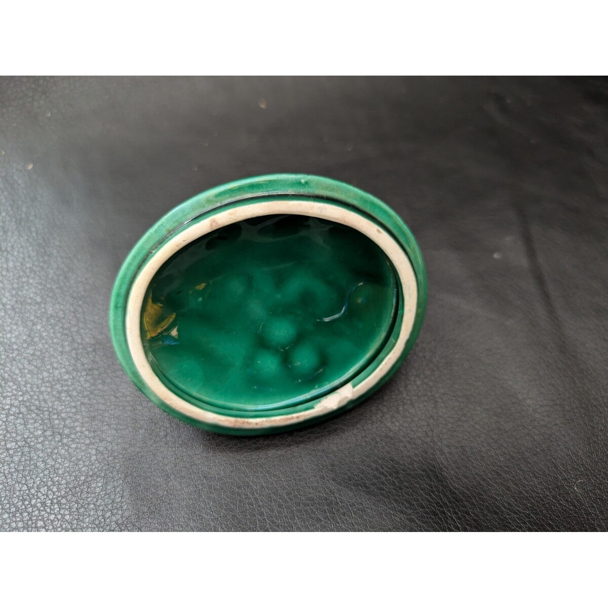 Le couvercle de remplacement en ceramique vintage presente un design festif de houx et de baies avec un glacage vert vif et des accents de baies rouges vifs. Ce couvercle de forme ovale comprend une poignee en boucle torsadee pour un levage facile et est ideal pour completer un sucrier, un pot de confiture ou une petite boîte de vacances. Le dessous presente un bord blanc non emaille pour un ajustement sûr sur les ustensiles de cuisine assortis. A noter qu'il y a un petit eclat sur le bord interieur comme indique sur les photos. Mesures : ? Longueur : 2,75" ? Largeur : 2,25" ? Longueur de la jante interieure : 2,25 pouces ? Largeur de la jante interieure : 1,75 pouce