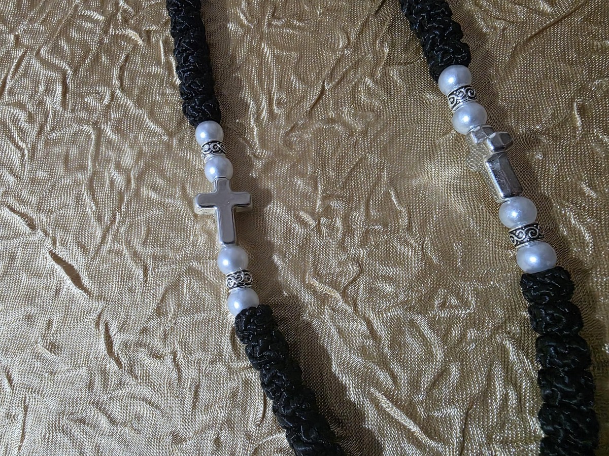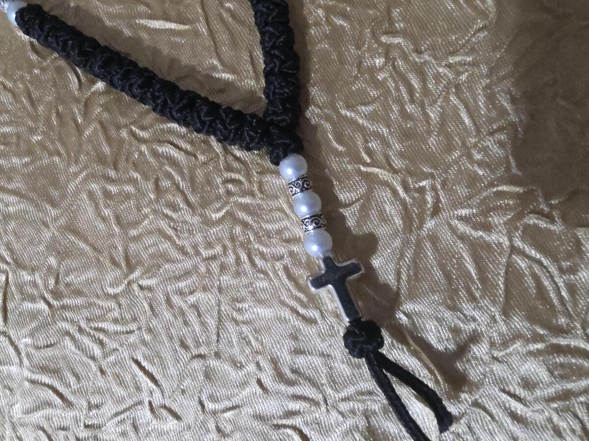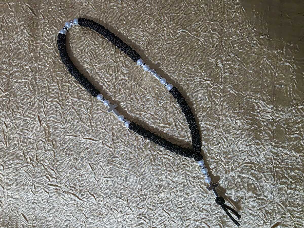 This is a handmade Christian Orthodox prayer rope, 50 knot prayer rope in black color, crafted in the traditional way, using tightly woven waxed woolen cord. Designed for prayer, meditation and spiritual focus, it also serves as a meaningful religious accessory of thoughtful gift.