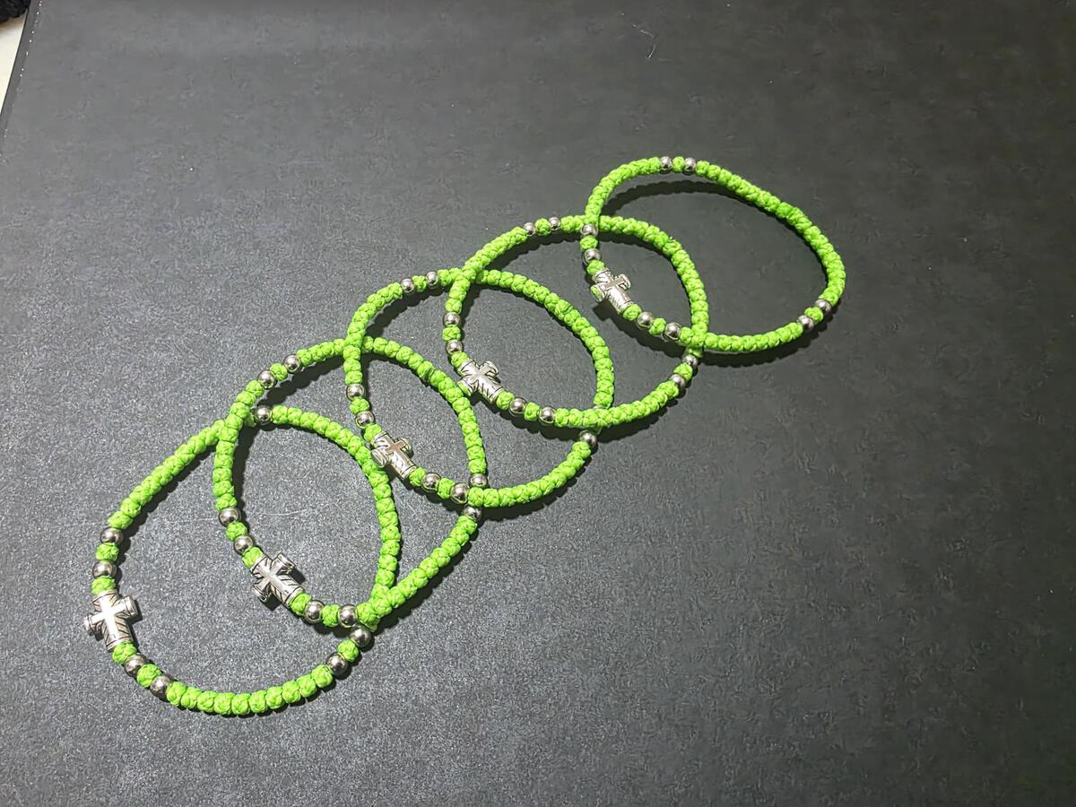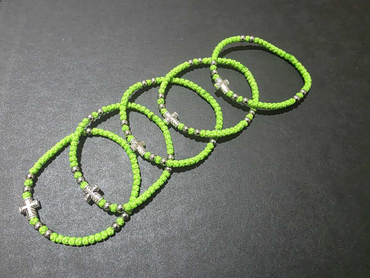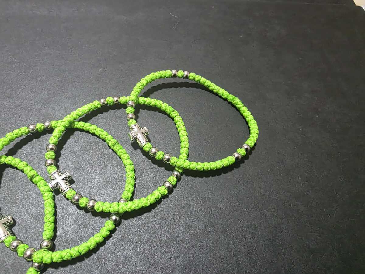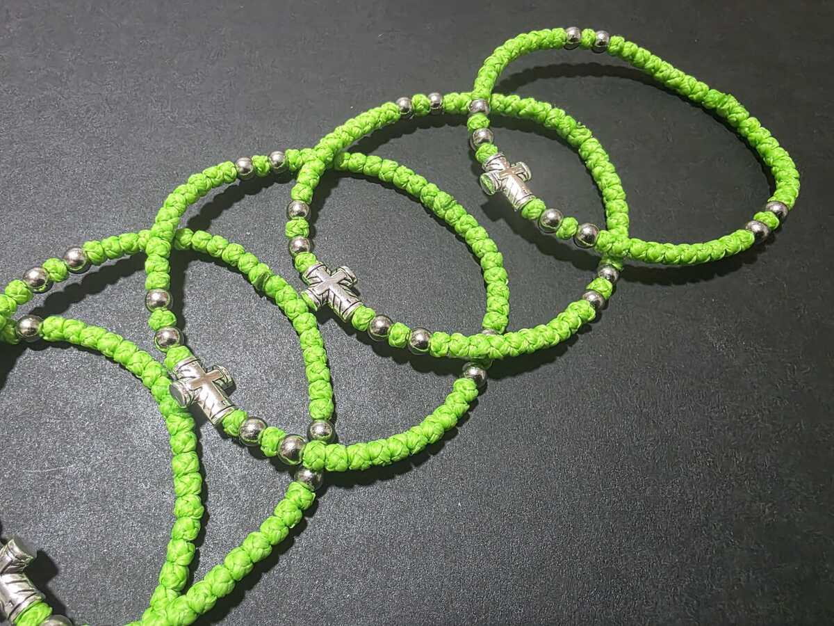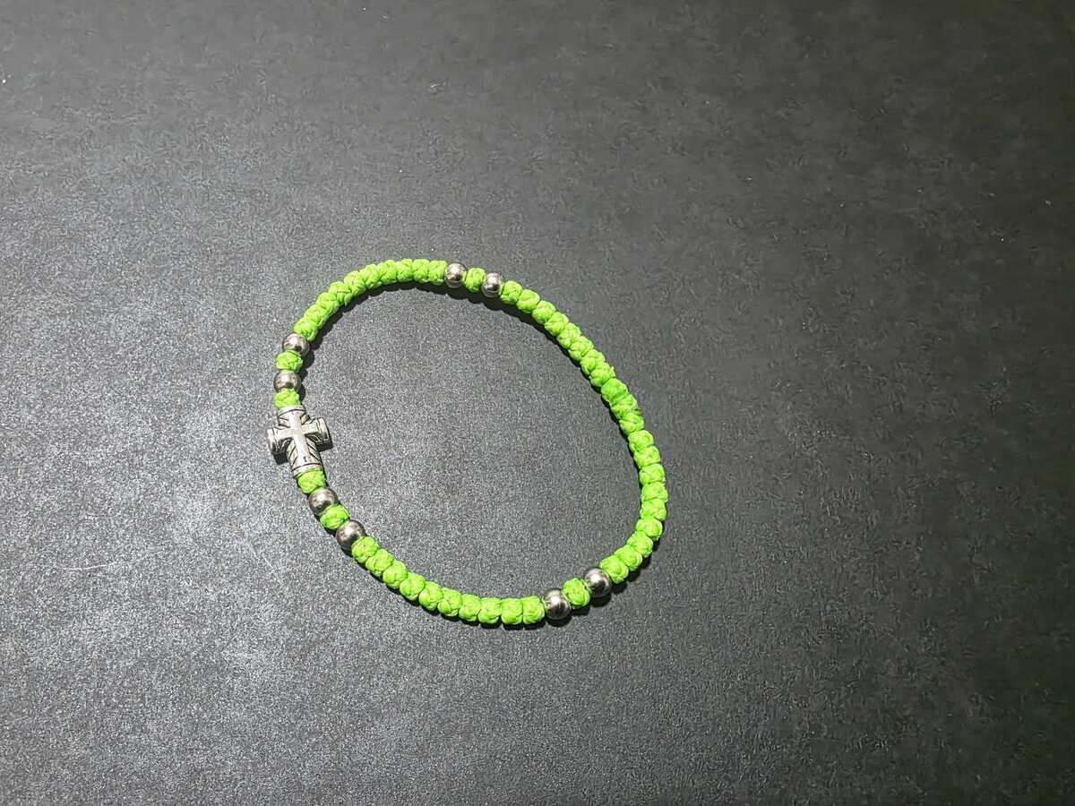 A handmade orthodox Christian prayer rope, bracelet prayer rope. It is a 52-72 thin knots bracelet in light green (grasshopper green) color and extra decorated with silver color beads. The bracelets in our shop are made by priests from the churches in Ohrid, Macedonia, the Balkan's Jerusalem. Completely handmade thin knots every each of them finished with a prayer. The prayer rope is made of high quality waxed wool thread. The waxed thread ensures water resistance and durability.