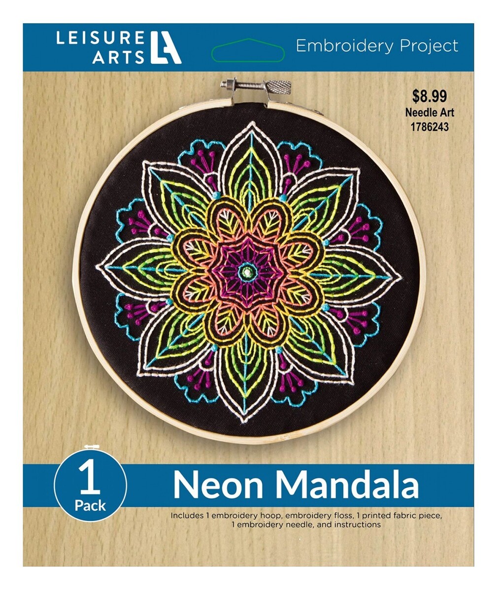 Leisure Arts Neon Mandala 6 Inch Embroidery Kit 49808. Leisure Arts Kit Embroidery Make In A Weekend 6 Inch Neon Mandala. Design by Tammy Street. Mandalas are in, and they?re exquisite, so you and your fingers will delight in every moment of this all-in-one project, with its colorful embroidered threads that pop in a big way on black fabric. Kit Includes: One 6 inch Hoop, 8 Floss Colors (total 25 yds), 9 inch x 9 inch Printed Fabric, 1 Needle and Instructions. CHK-LEA49808