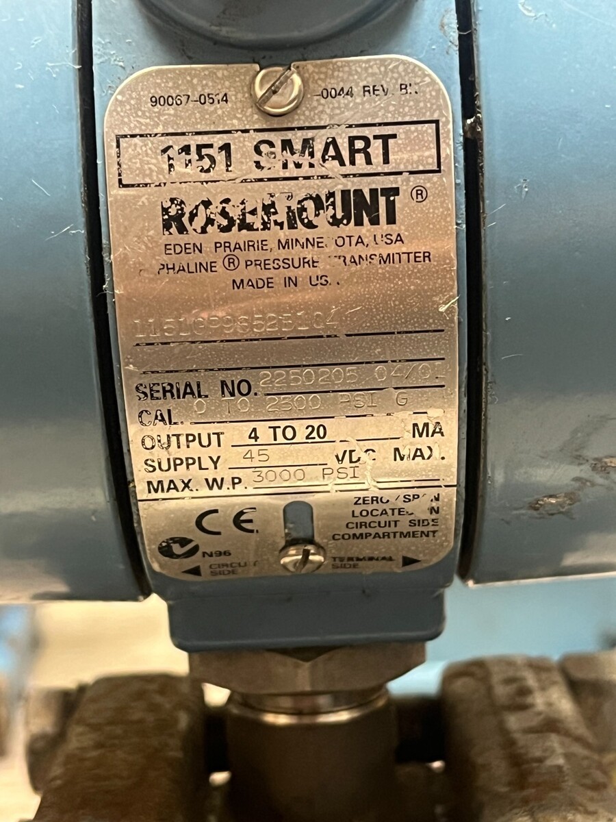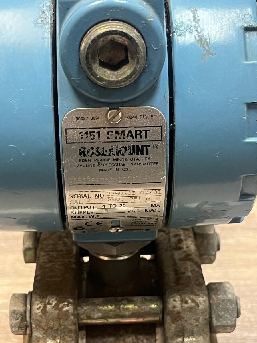 Rosemount 1151GP9S52B1Q4 gauge pressure transmitter with bottom sensor block P/N 1151?0112?0092 (S/N 7072563) and compact mounting bracket. The 1151GP series is a classic 4?20 mA industrial transmitter for liquid, gas, and vapor pressure measurement, widely used in refineries, chemical plants, and utilities. Span and zero are field?adjustable, and the unit operates from a 12?45 VDC loop supply through a standard 4?20 mA current loop. Exact calibrated range is as marked on the metal tag; please refer to close-up photos to verify it matches your application