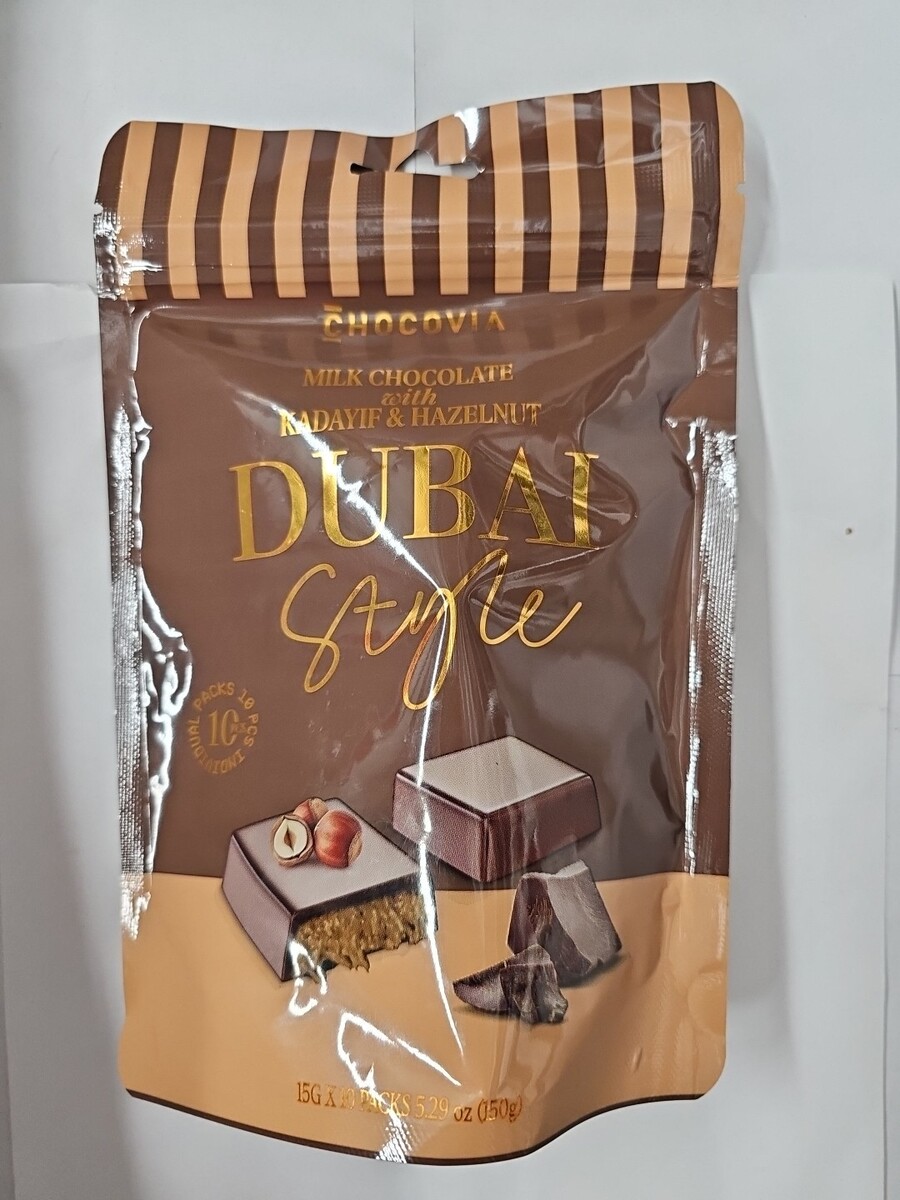 The product is a bag of chocovia dubai Milk Chocolate with Kadayif Hazelnut, containing 150g of chocolate sweets. With an expiration date of 2/28/2027, this chocolate is ideal for serving at parties and gatherings. The milk chocolate flavor is enhanced by the addition of hazelnut, making it a delicious treat for any occasion. This dubai-inspired chocolate is sure to sweeten any pantry with its unique style and generous serving size of 2 pieces per serving, providing a total of 5 servings for your enjoyment.