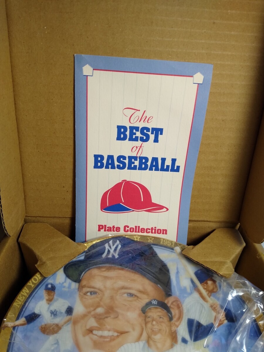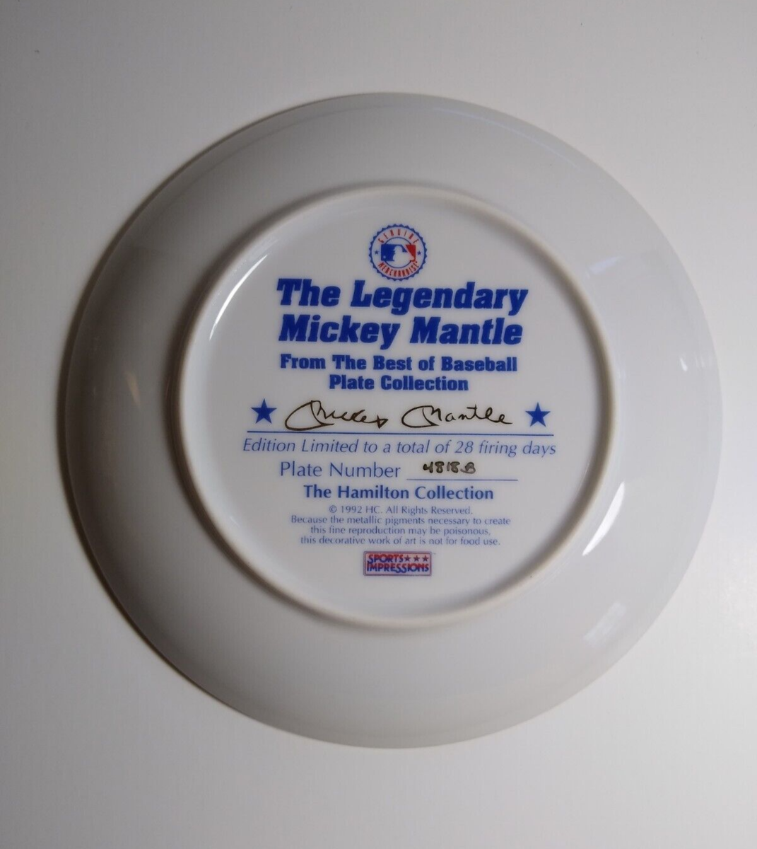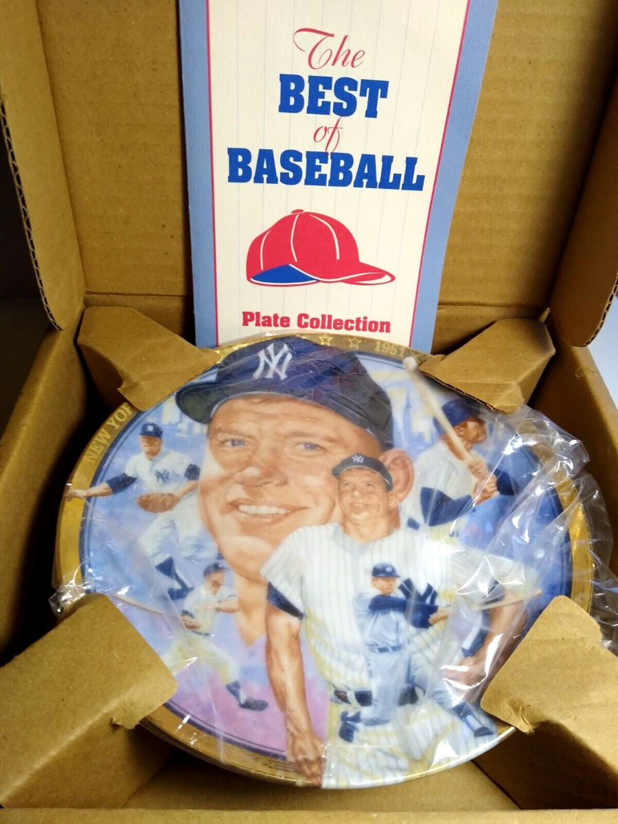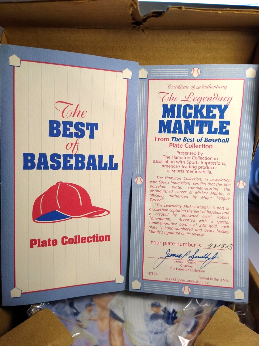 The product is a 1993 Mickey Mantle baseball plate by Hamilton Collection, featuring the New York Yankees player. This officially licensed vintage sports memorabilia item comes in its original box, certificate, and folder and is numbered limited edition. It was made in the United States and is a collectible piece for fans of Mickey Mantle and the New York Yankees.