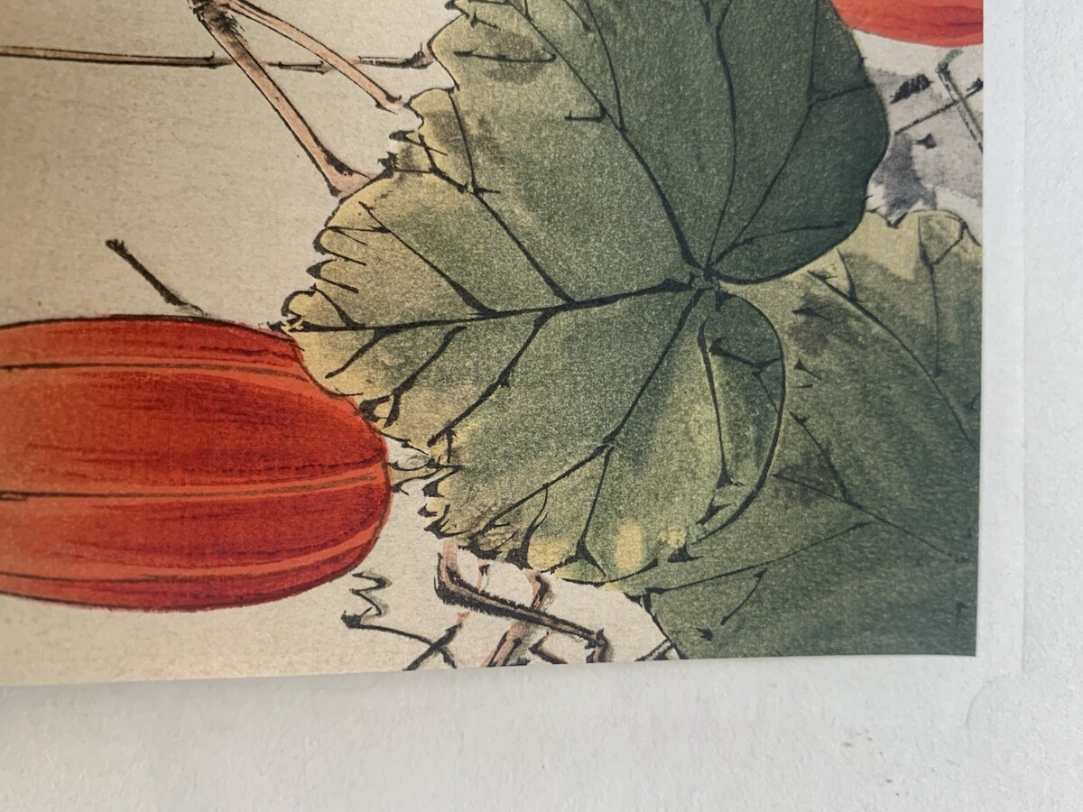 Title: Starling and "karasu-uri" (Snake Gourd). Woodblock print.