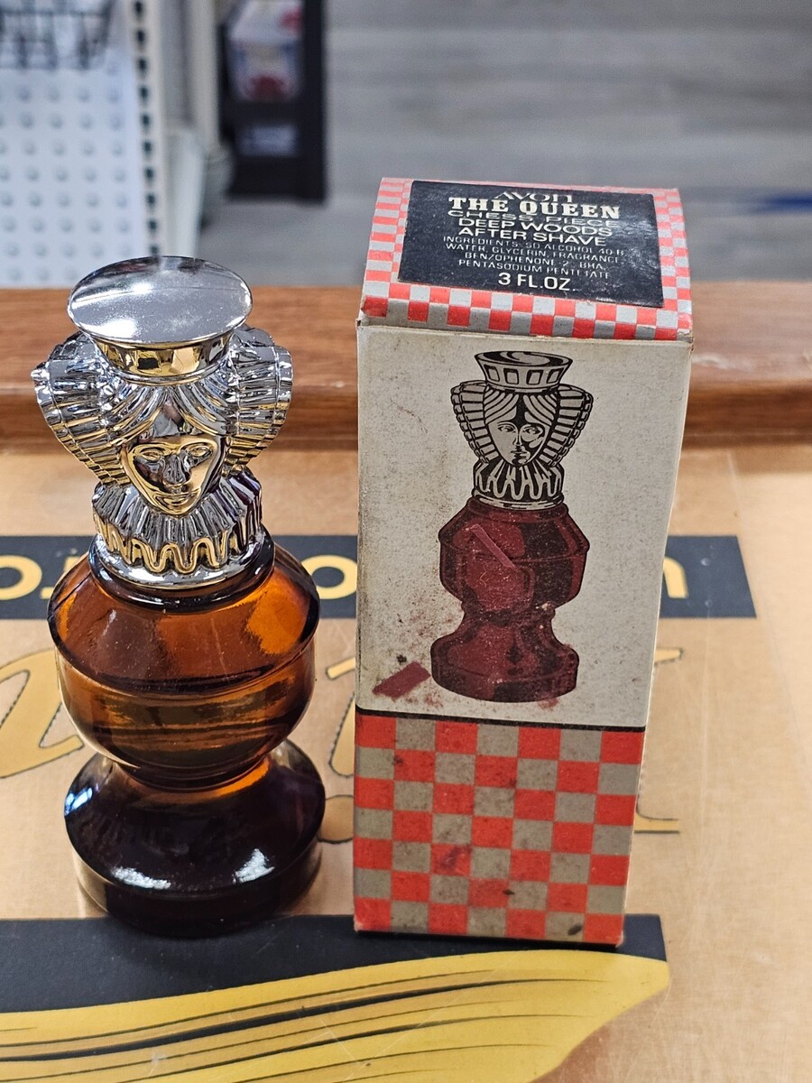 The Vintage Avon The Queen Chess Piece Deep Woods After Shave is a collectible perfume item from Avon, made in the United States. This product is a full 3 oz. bottle of after shave, featuring a unique and nostalgic design with a chess piece theme. Perfect for collectors of vintage Avon products or those looking to add a classic scent to their collection.