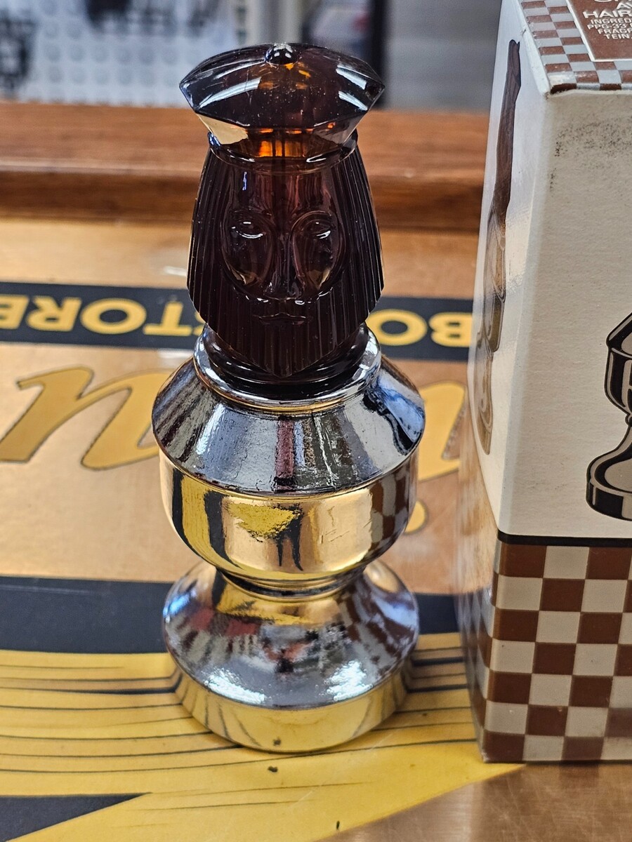 The Vintage Avon The King II Chess Piece Protein Hair/Scalp Lotion is a unique collectible item for men. This 3 fl oz lotion is infused with protein to nourish and hydrate the scalp and hair. With its distinctive chess piece design and iconic Avon branding, this product is a sought-after item for collectors of vintage beauty products. Perfect for those looking to add a touch of nostalgia to their grooming routine.