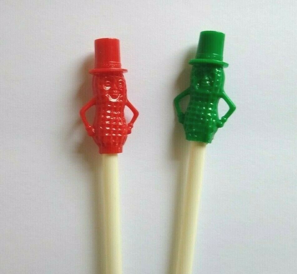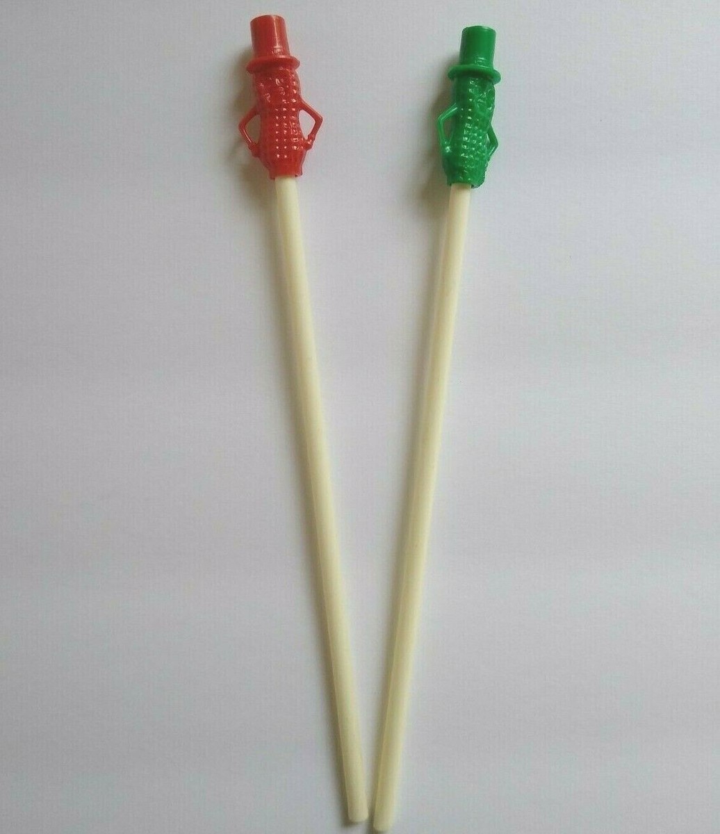 Original vintage 1950's Planters Peanuts drinking straw set of (2). The tops are hard plastic with green and red . Peanut figure. Size is 8".