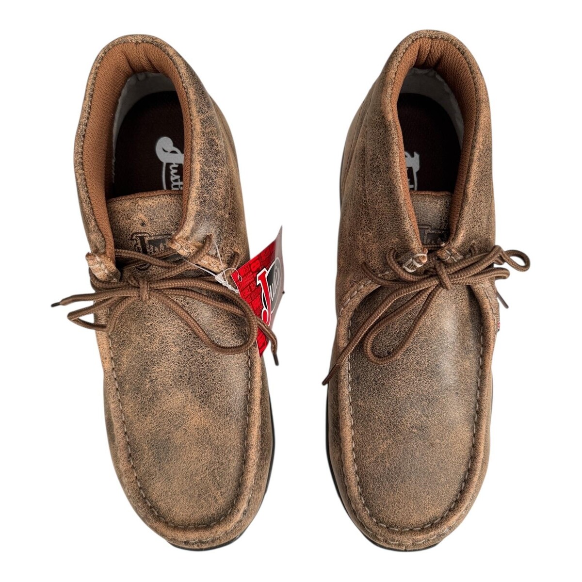 Design details: Moc-inspired stitching, padded collar, two-eyelet laces, "STEEL TOE" debossed on quarter, Justin side tab