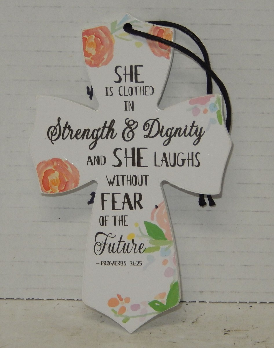 She Is Clothed Proverbs 31:25 Decorative Mounted Plaque Wall Cross 5" x 3"