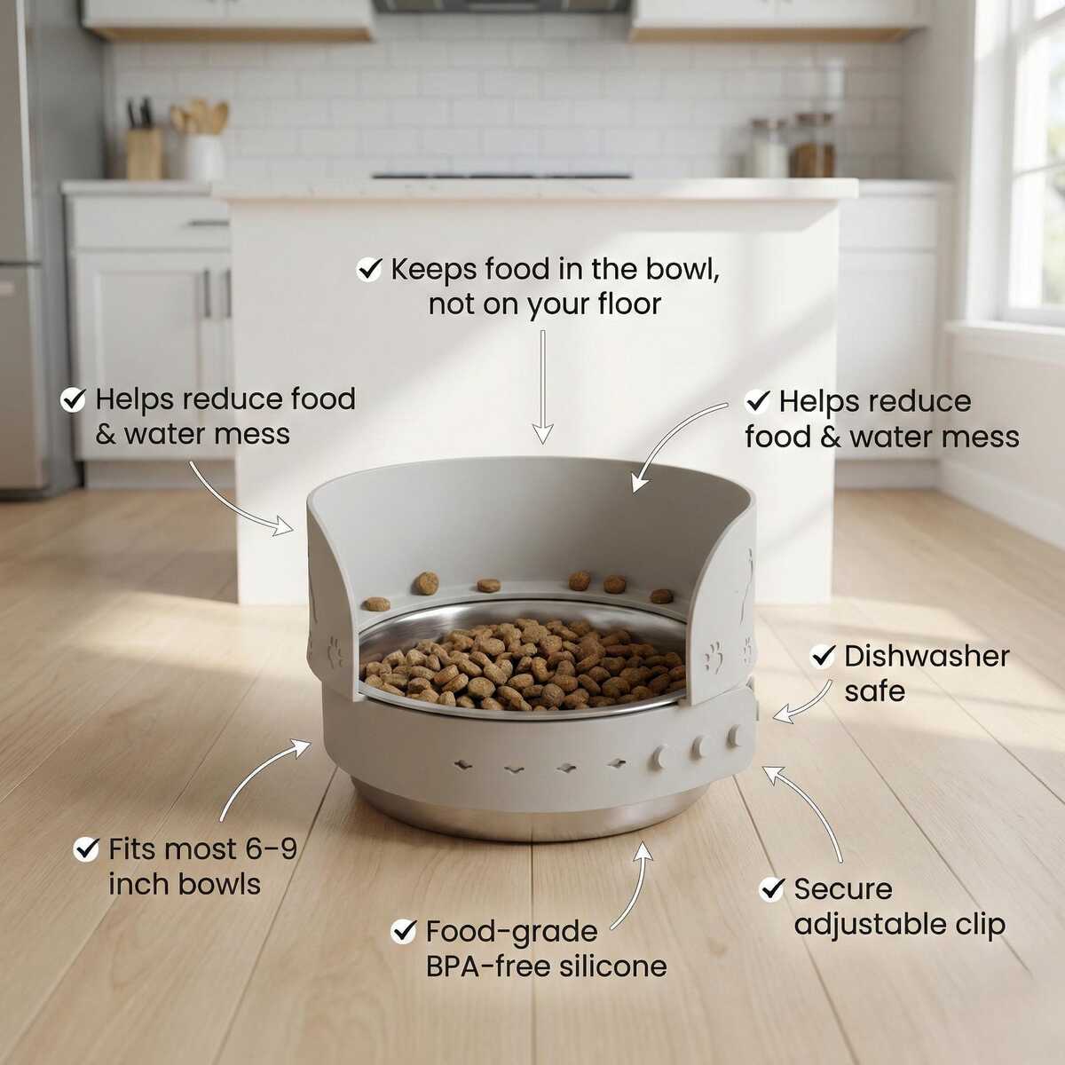 The adjustable splash guard wraps around your existing pet bowl and creates a raised edge that helps keep kibble, crumbs, and water inside the bowl instead of on your floor.