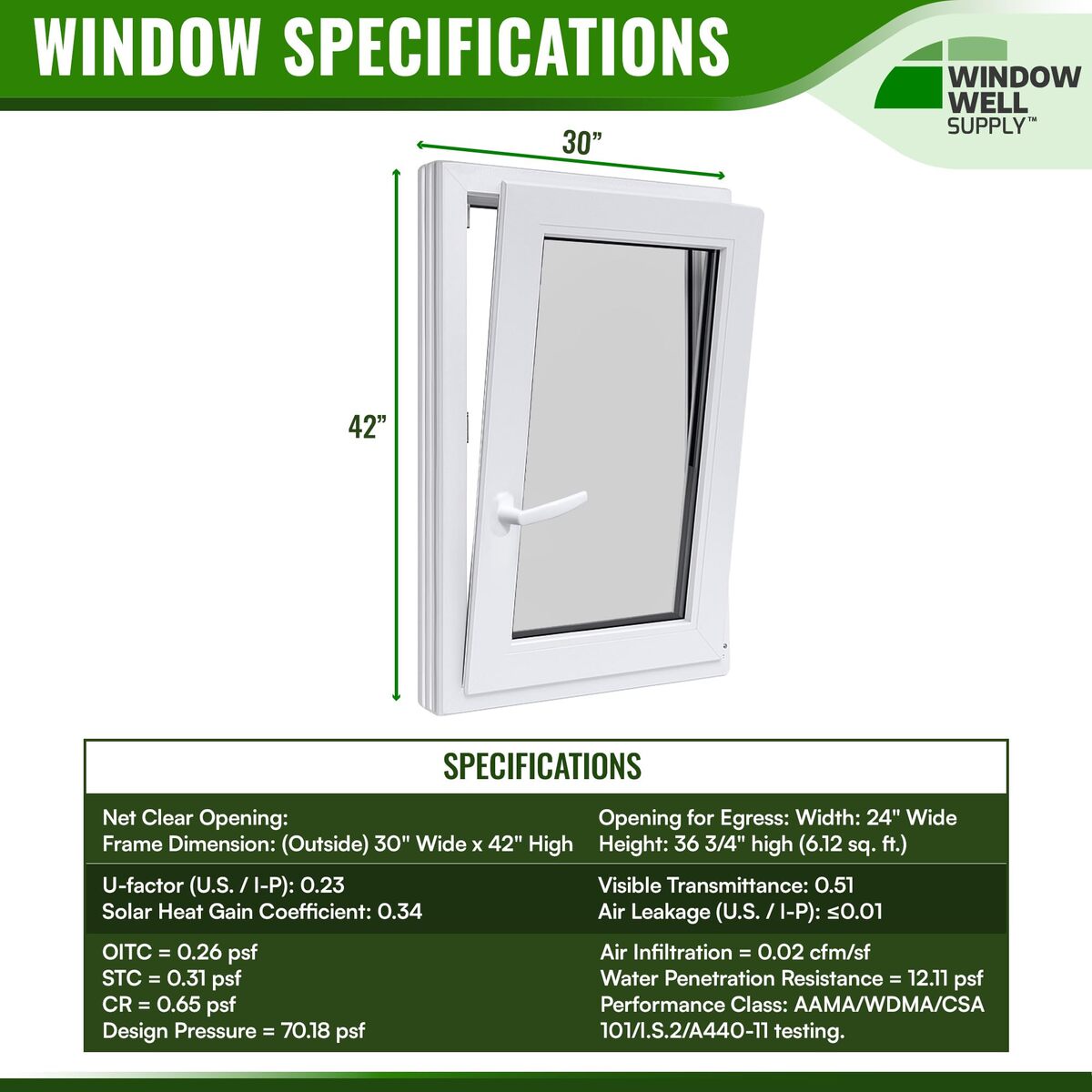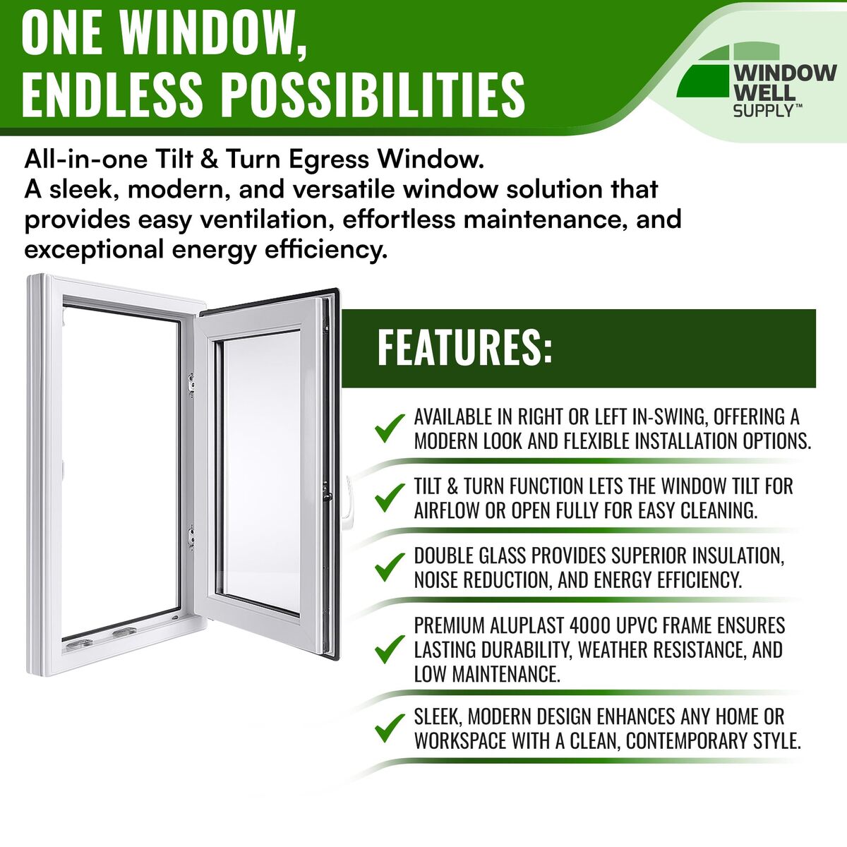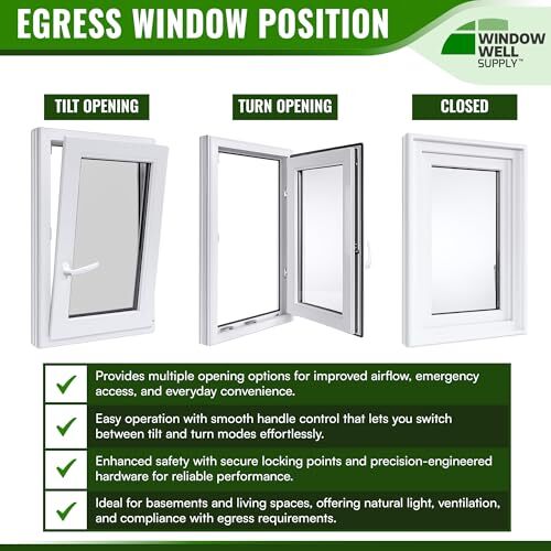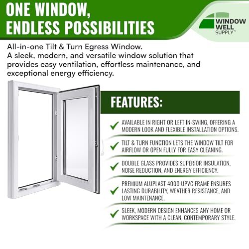 Product description: This Tilt Turn Egress Basement Window is engineered for energy efficiency, ventilation flexibility, and dependable performance in residential and light commercial applications. Designed specifically for basement egress installations, it features a dual-function opening system that allows the sash to tilt inward at the top for controlled airflow or swing fully inward for maximum opening area and easy interior cleaning. The insulated double pane glass unit is argon-filled and constructed with a 15/16" (24mm) sealed glazing system designed to reduce heat transfer and improve year-round comfort. With a U-factor of 0.23, this energy-efficient vinyl window enhances basement window insulation while helping maintain consistent indoor temperatures. The sealed design also contributes to improved sound insulation for quieter interior spaces. Built with a premium Aluplast 4000 uPVC vinyl frame featuring a 2" (70mm) 5-chamber profile depth, this basement egress window delivers structural strength, durability, and thermal performance. The white interior and exterior finish resists weathering, moisture, and discoloration for long-term, low-maintenance performance in a variety of climates. Equipped with precision ROTO hardware and a dual backstop gasket sealing system, the window provides smooth tilt-and-turn operation, enhanced weather resistance, and secure locking performance. The reinforced locking system meets RC2 burglar resistance standards, offering added peace of mind for residential installations. Combining modern European design with high-performance construction, this egress window enhances natural light, ventilation, and energy efficiency. Suitable for basement remodels, home additions, and new construction projects, it provides a long-lasting and versatile window solution for houses requiring code-compliant egress performance.