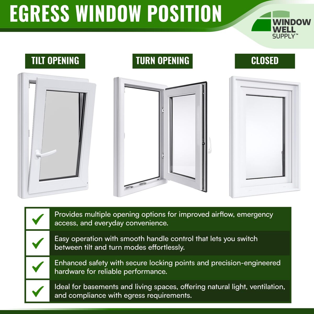Bullet point: DUAL TILT TURN EGRESS FUNCTION: Designed as a basement egress window for houses, this 48" W x 48" H tilt and turn casement window with left or right in-swing allows top tilt ventilation or full inward swing opening for wide access and easy cleaning. Engineered with premium ROTO hardware for smooth operation in living spaces, offices, basement remodels, or new construction windows.