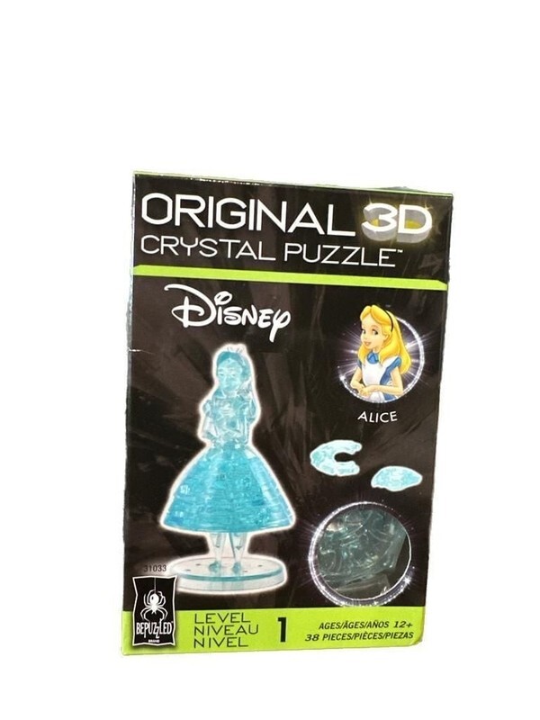 Disney Alice in Wonderland 3D Crystal Puzzle by BePuzzled. This challenging brainteaser features 38 interlocking, translucent crystalline pieces that assemble into a beautiful figurine of Alice. Rated Level 1 difficulty, it is perfect for Disney fans and puzzle enthusiasts ages 12 and up.