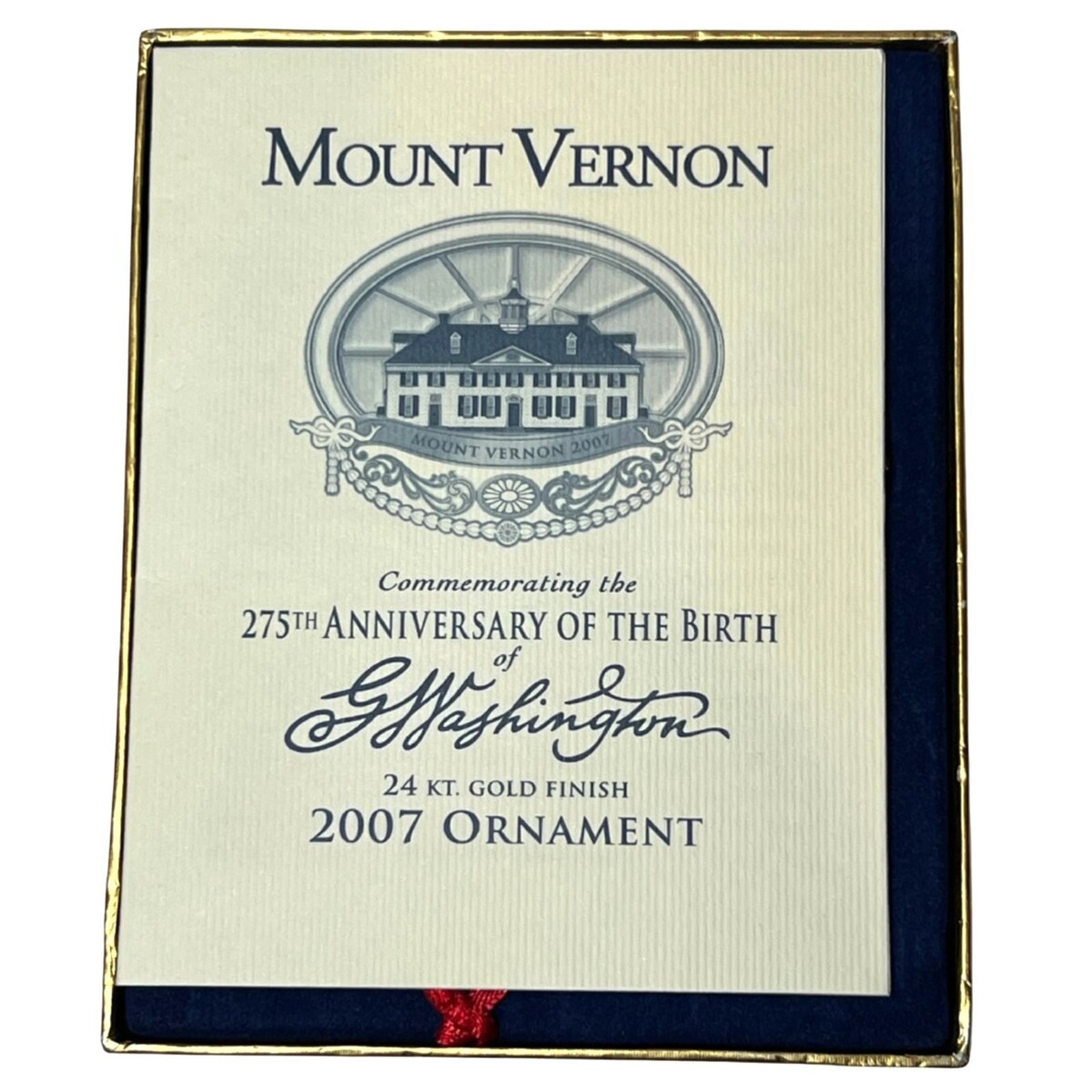 Mount Vernon collectible Christmas ornament commemorating the 275th anniversary of the birth of George Washington. This 2007 ornament features the Mount Vernon mansion design with a 24 kt gold finish.