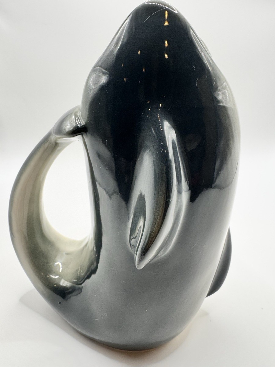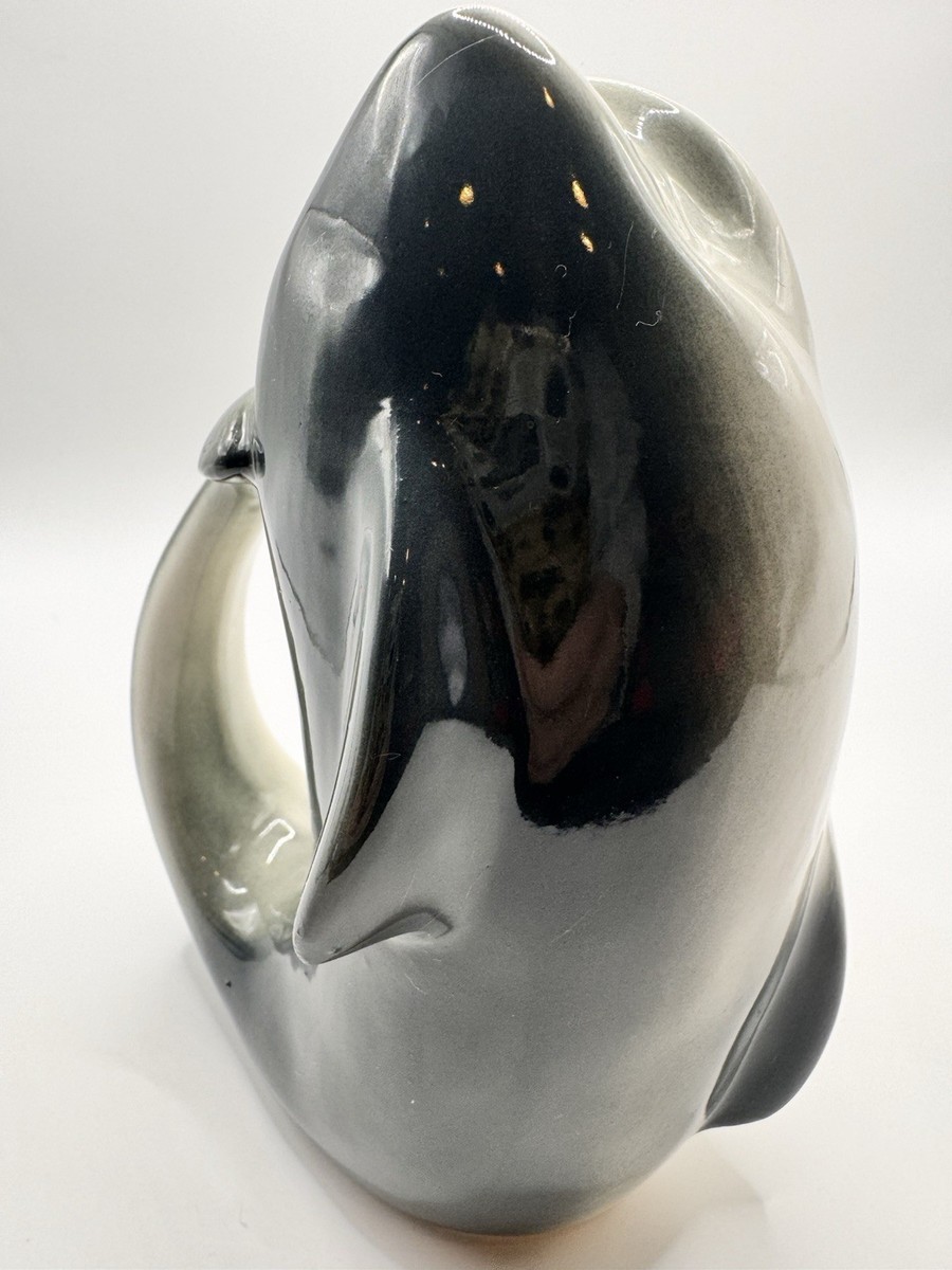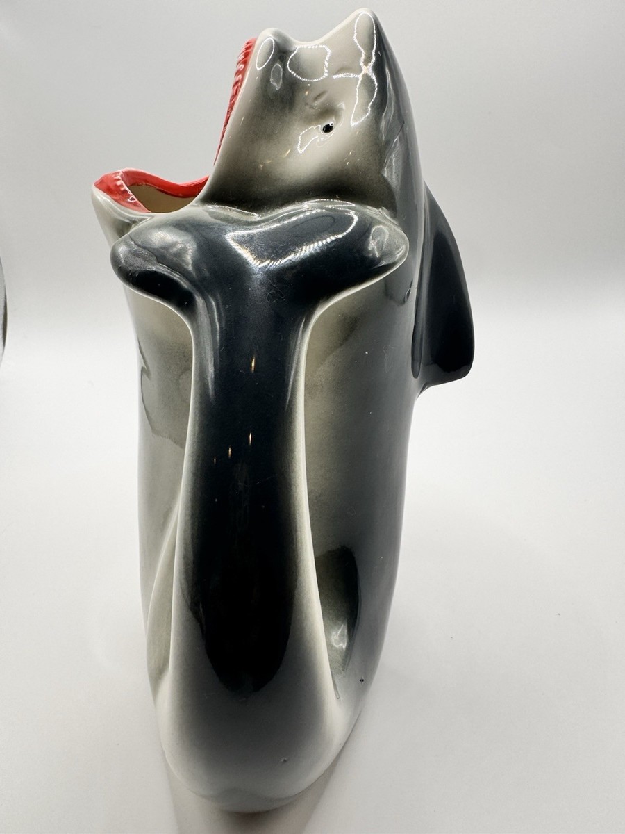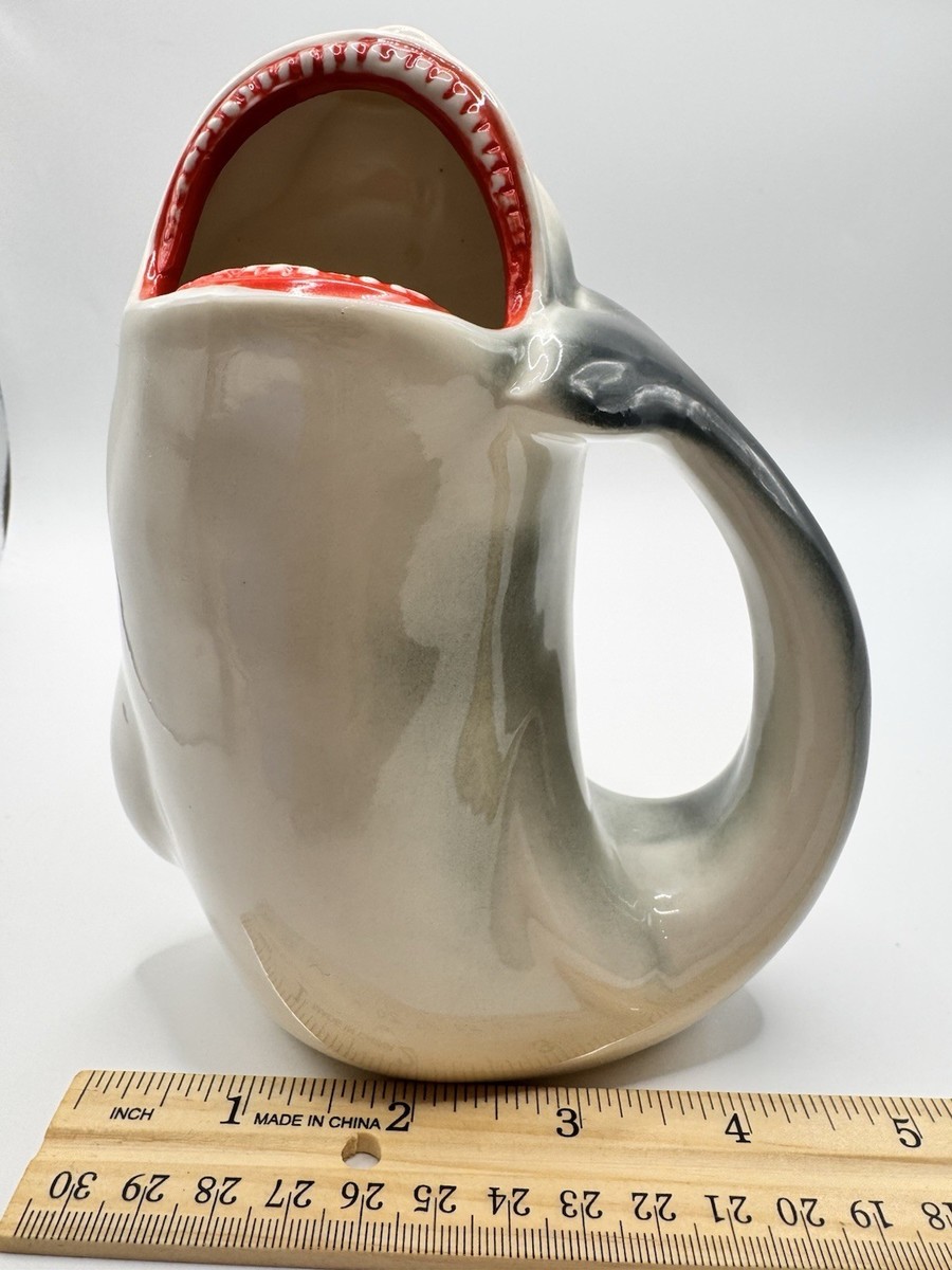 This vintage novelty shark mug features a bold three-dimensional sculpted shark head design with the wide open mouth forming the drinking rim. The interior of the mouth is finished in bright red with detailed teeth around the rim, giving it a dramatic ocean-themed look that really stands out. The handle curves into the shark?s tail, creating a fun and unusual silhouette that makes this piece both functional and highly displayable. Novelty animal mugs like this are popular with collectors and make great gifts for shark lovers, beach house decor, nautical themed kitchens, or anyone who enjoys unique vintage drinkware. The sculpted ceramic design gives it strong shelf presence whether used for coffee, displayed in a mug collection, or added to ocean themed decor. Measurements are shown in the photos for reference.