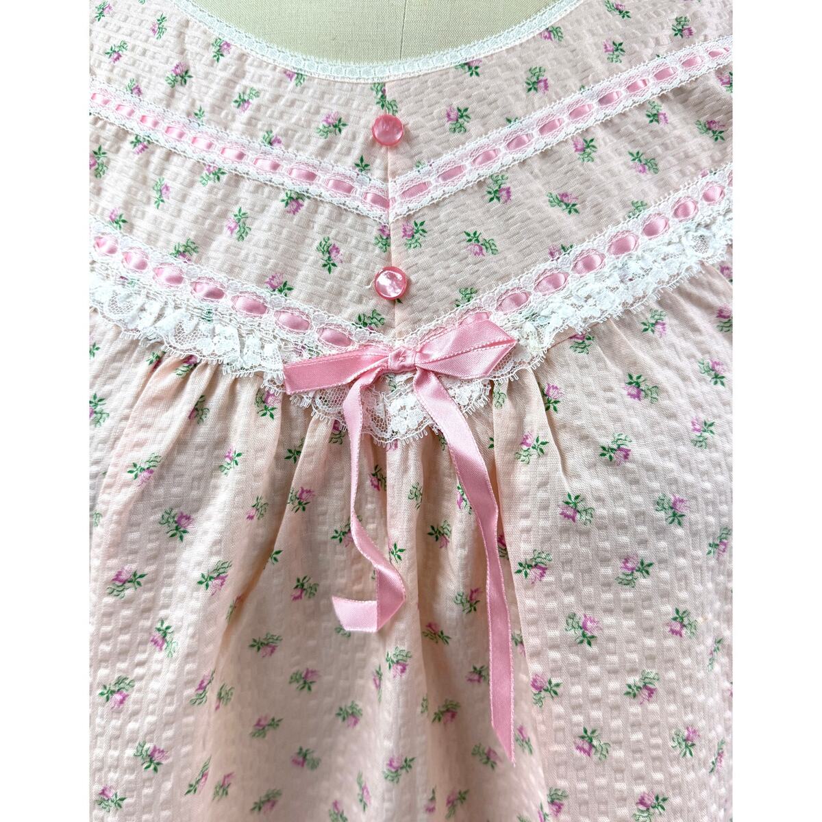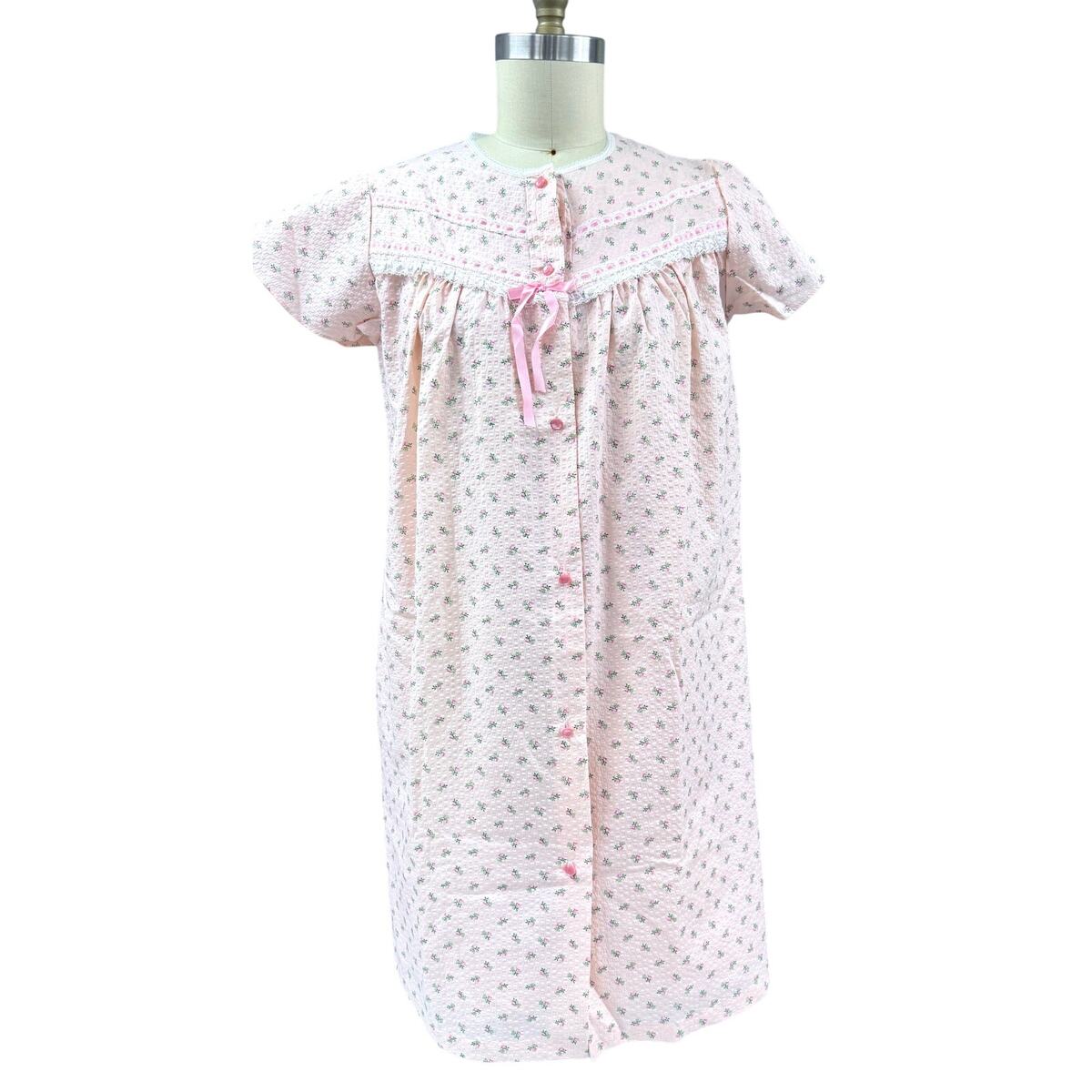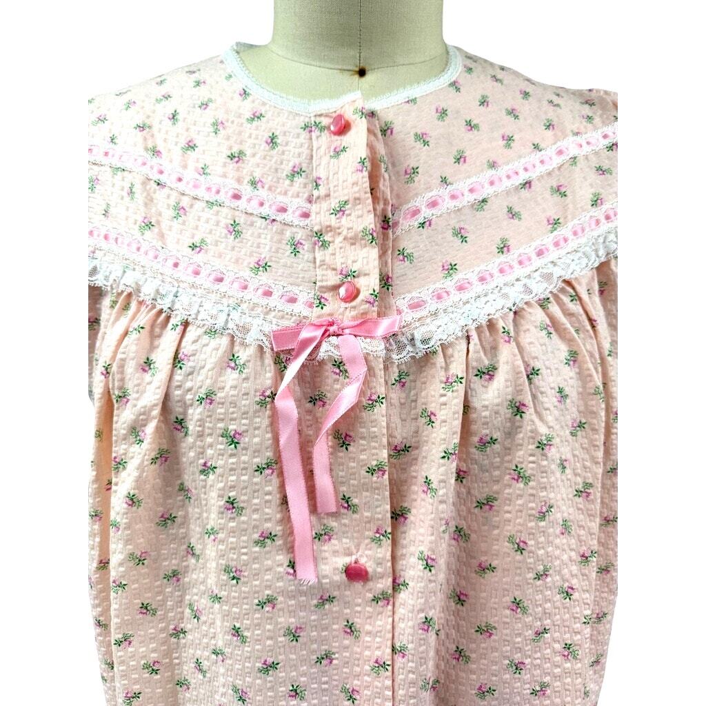 1960s Amy Sue pink rose print seersucker nightgown and matching robe set featuring delicate lace yoke detailing, tonal pink buttons, and ribbon bow accents. --- What you?ll love about this Amy Sue set is the charming floral print and classic mid-century housecoat silhouette that captures the cozy femininity of vintage lounge and sleepwear.
